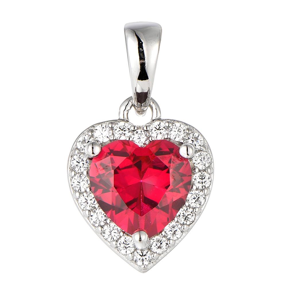 Smykke i sølv (925). Rødt hjerte-sirkon med blanke sirkoner rundt.