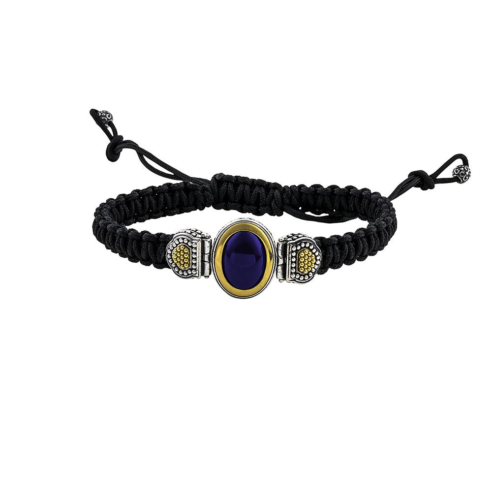 Et stilrent herrearmbånd med flettet tekstilsnor og sølv med svart onyx