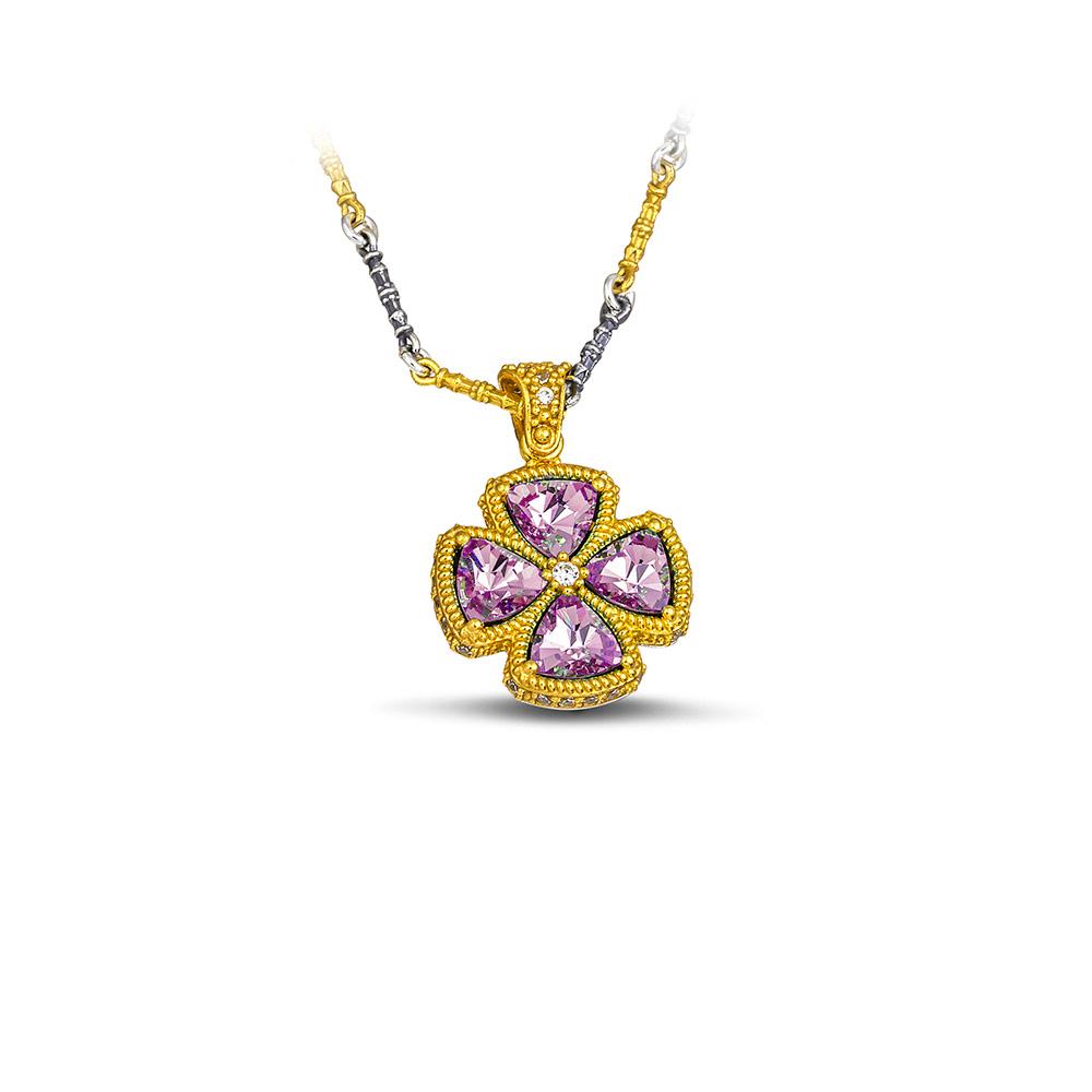 Fra Passatempo-kolleksjonen, et vakkert anheng formet som et kors, dekorert med rosa trekantede Swarovski-krystaller og forgylte, utsmykkede innfatninger.