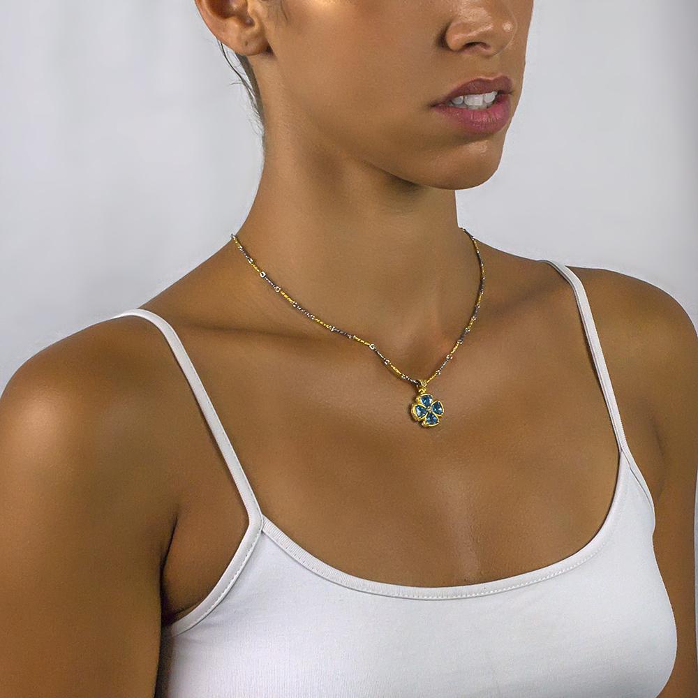 Fra Passatempo-kolleksjonen, et vakkert anheng formet som et kors, dekorert med lyse blå trekantede Swarovski-krystaller og forgylte, utsmykkede innfatninger.