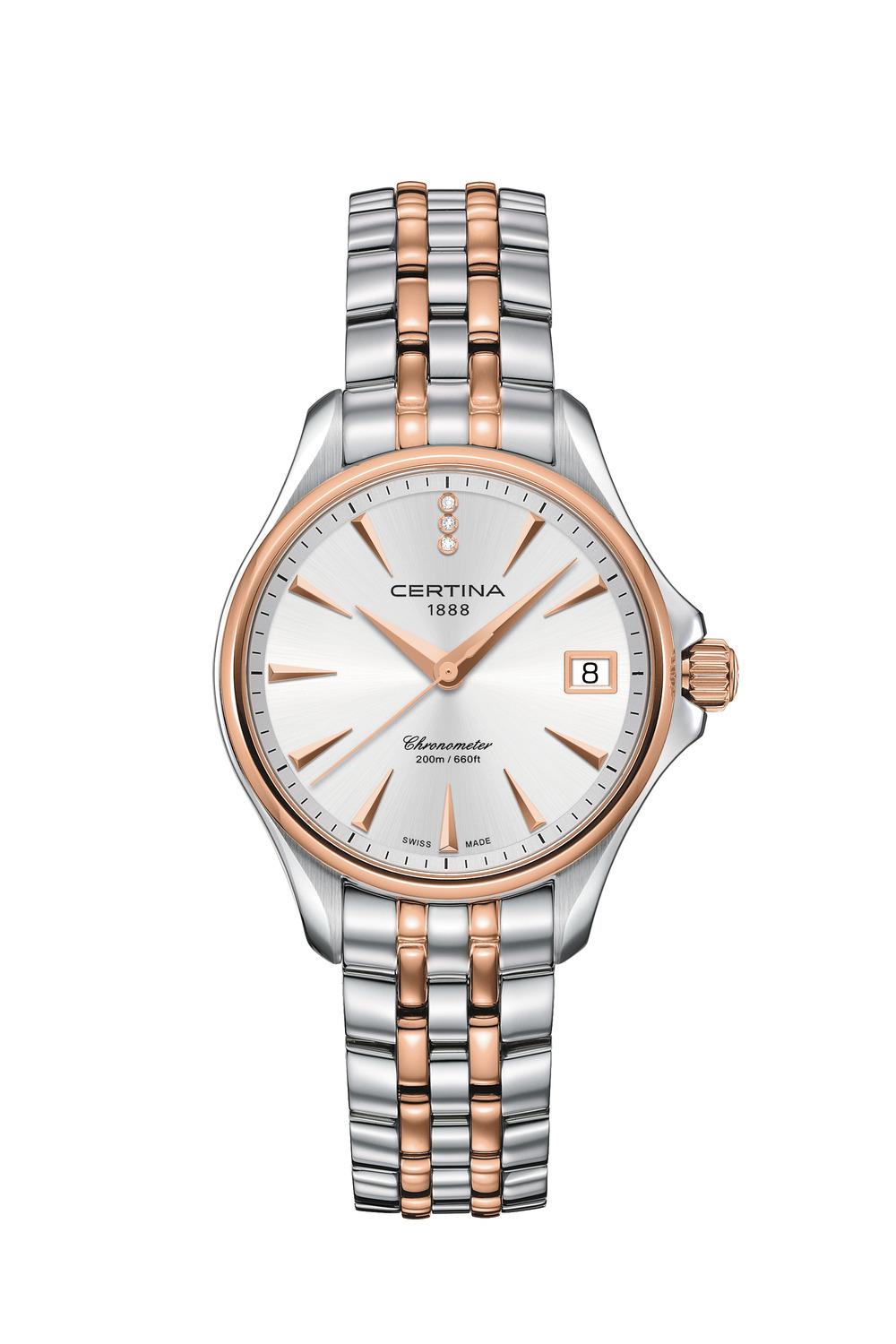 Lekker klokke fra Certina med sølvfarget urskive og bicolor stållenke stål/rosé.