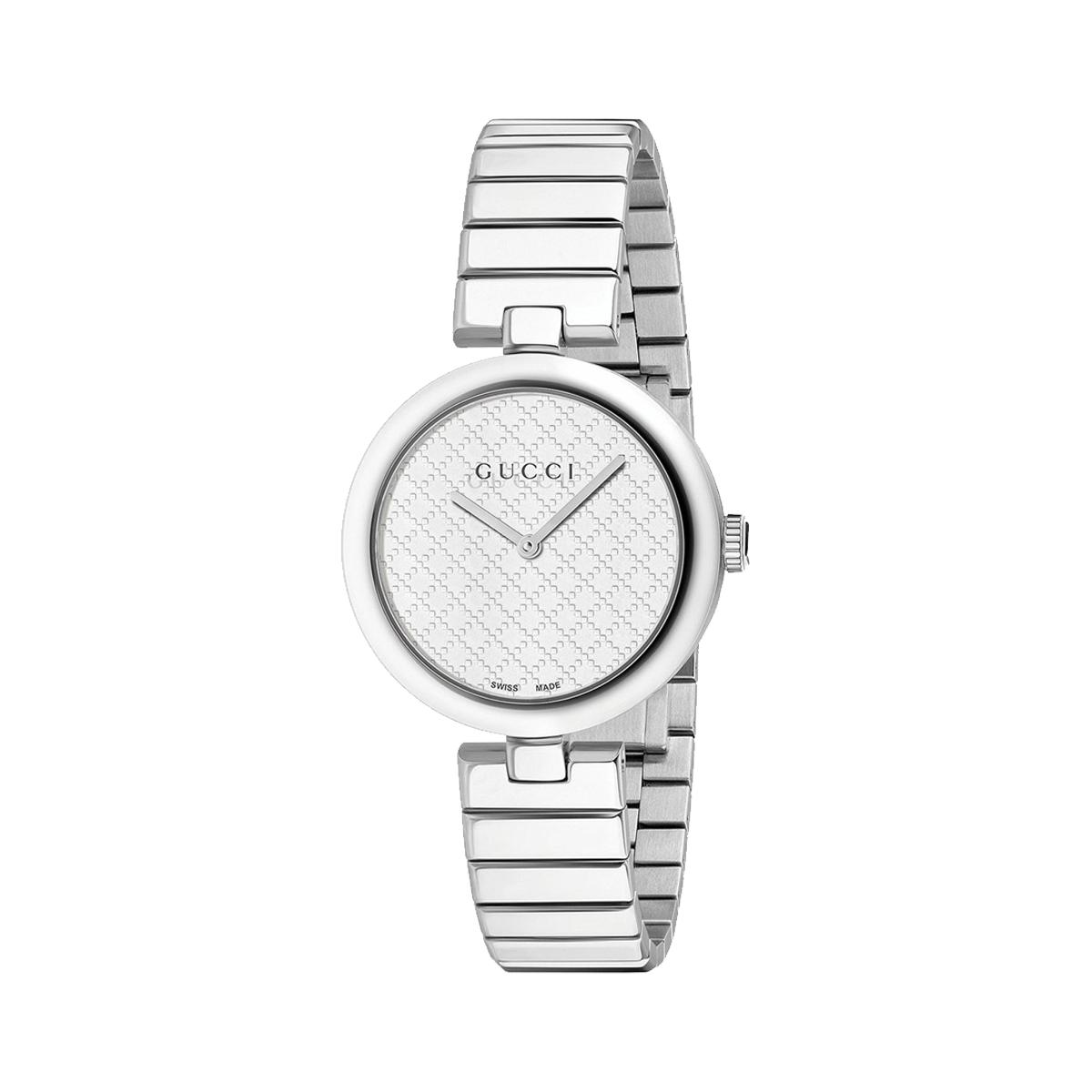 Lekker klokke fra Gucci med sølvfarget lenke og hvit urskive. Størrelse 32mm