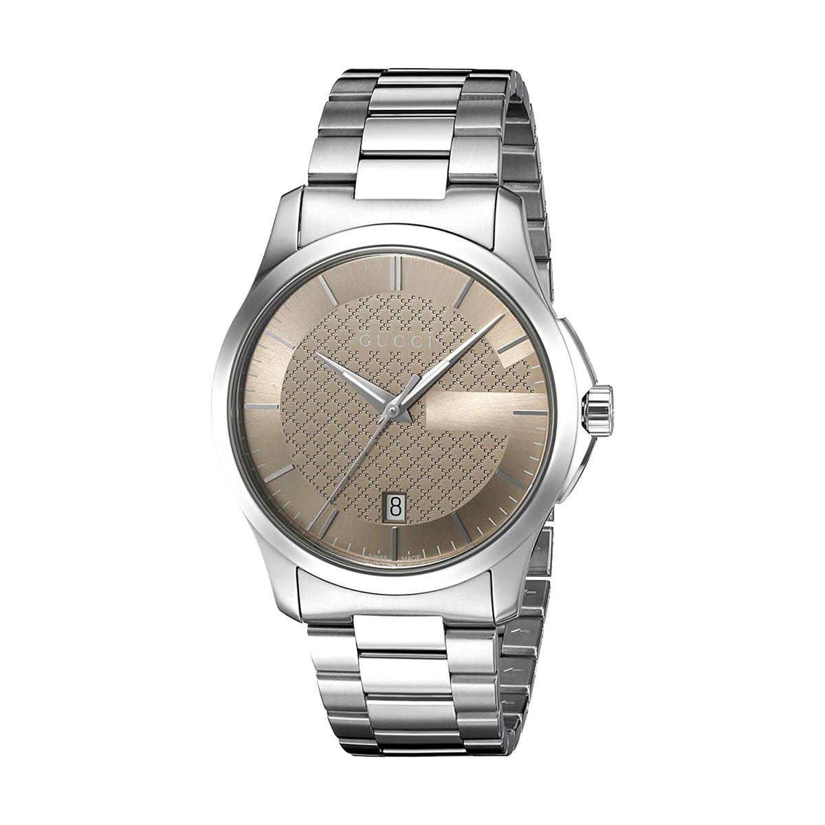 Klassisk klokke fra Gucci med sølvfarget lenke og brun urskive. Klokken har datovisning. Størrelse 38mm