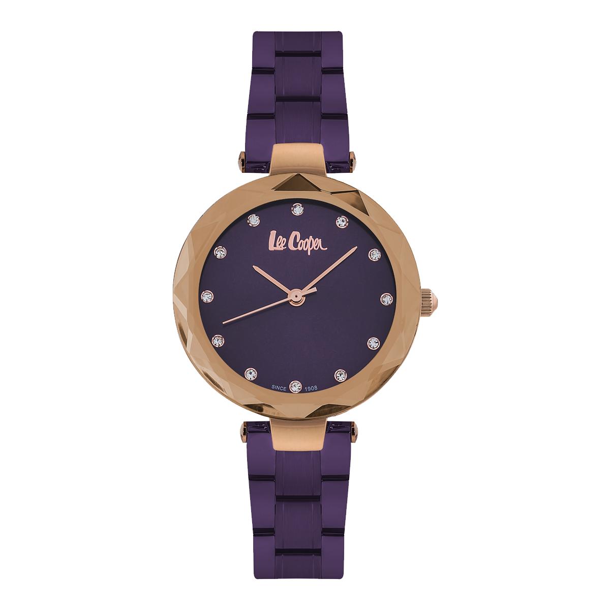 Lekker gullfarget dameklokke fra Lee Cooper med lilla urskive. Vanntett til 3ATM