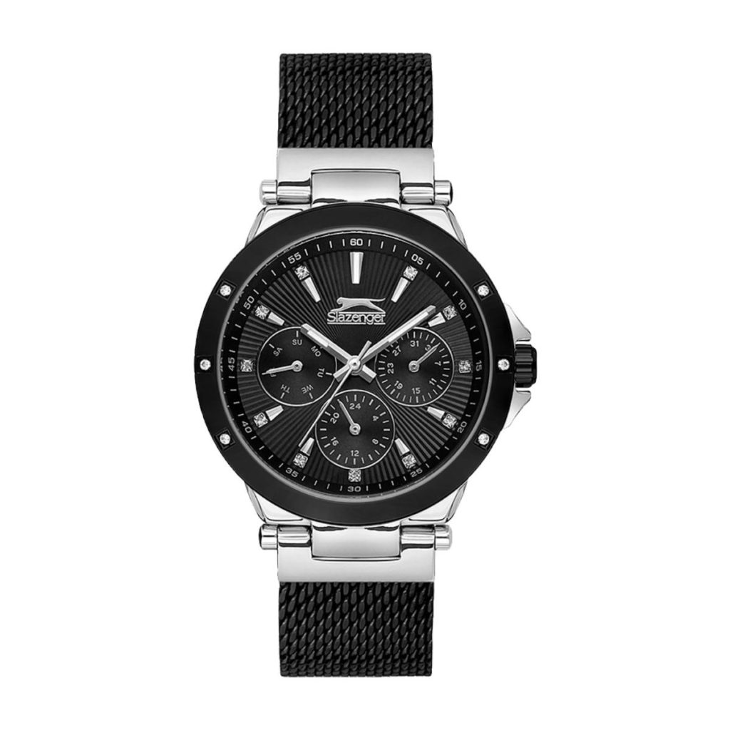 Stilig herreklokke med svart skive og skinnreim og kasse + detaljer i roséfarge. I tillegg følger det med en sølvfarget stållenke.