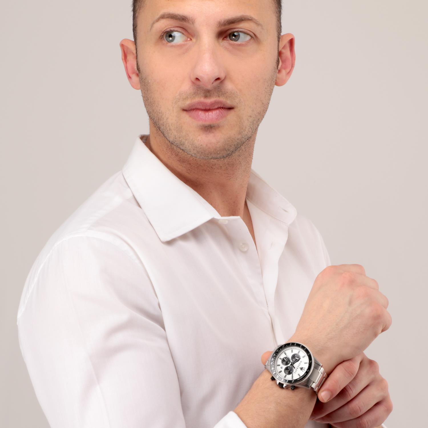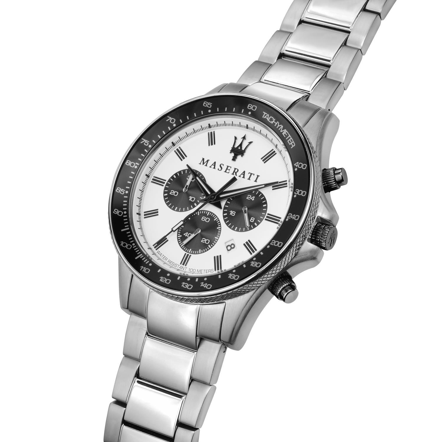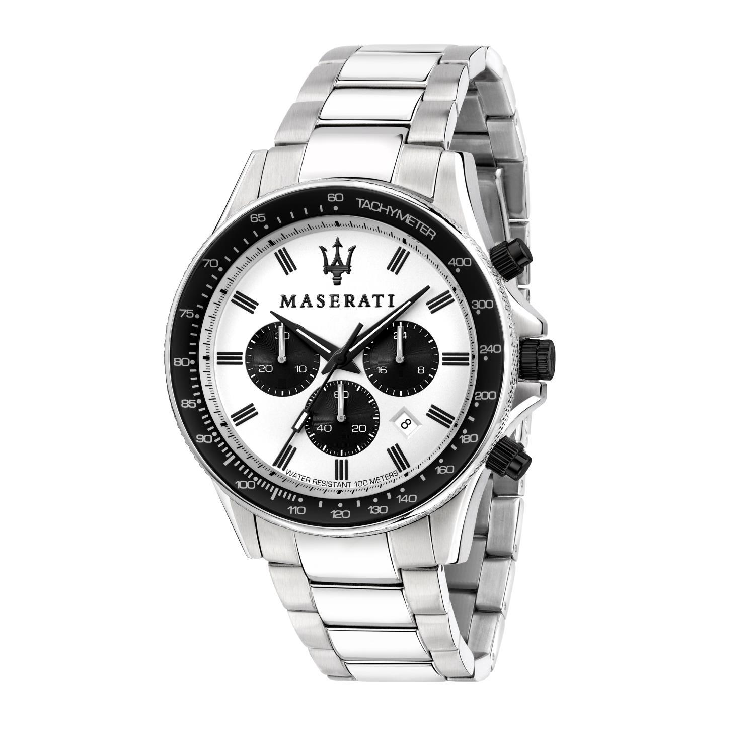 Herreklokke fra Maserati med hvit urskive og sølvfarget stållenke. Klokken har svarte detaljer.