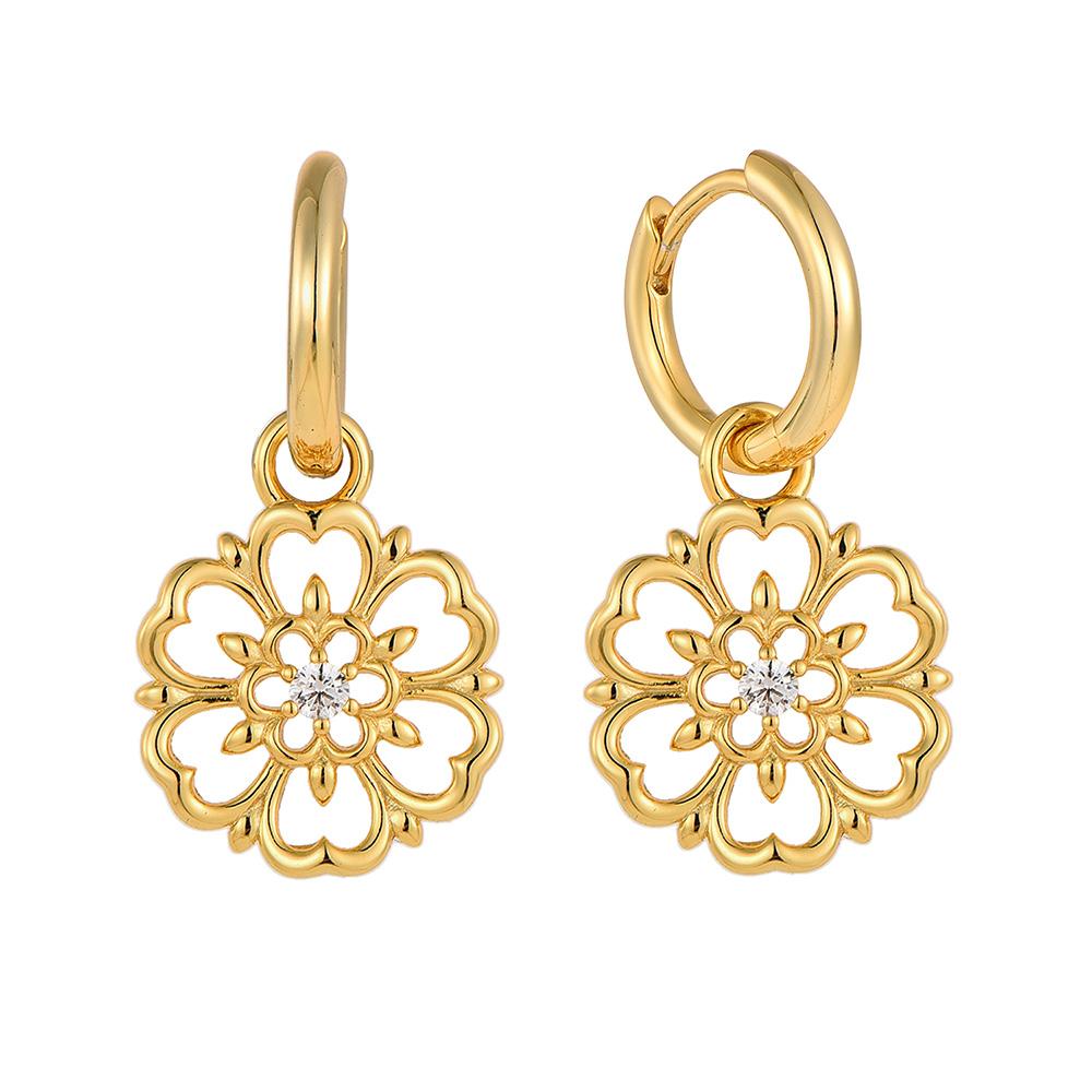 Øreringer i forgylt sølv (925). Trondhjemsrose med blank sirkon i midten.
