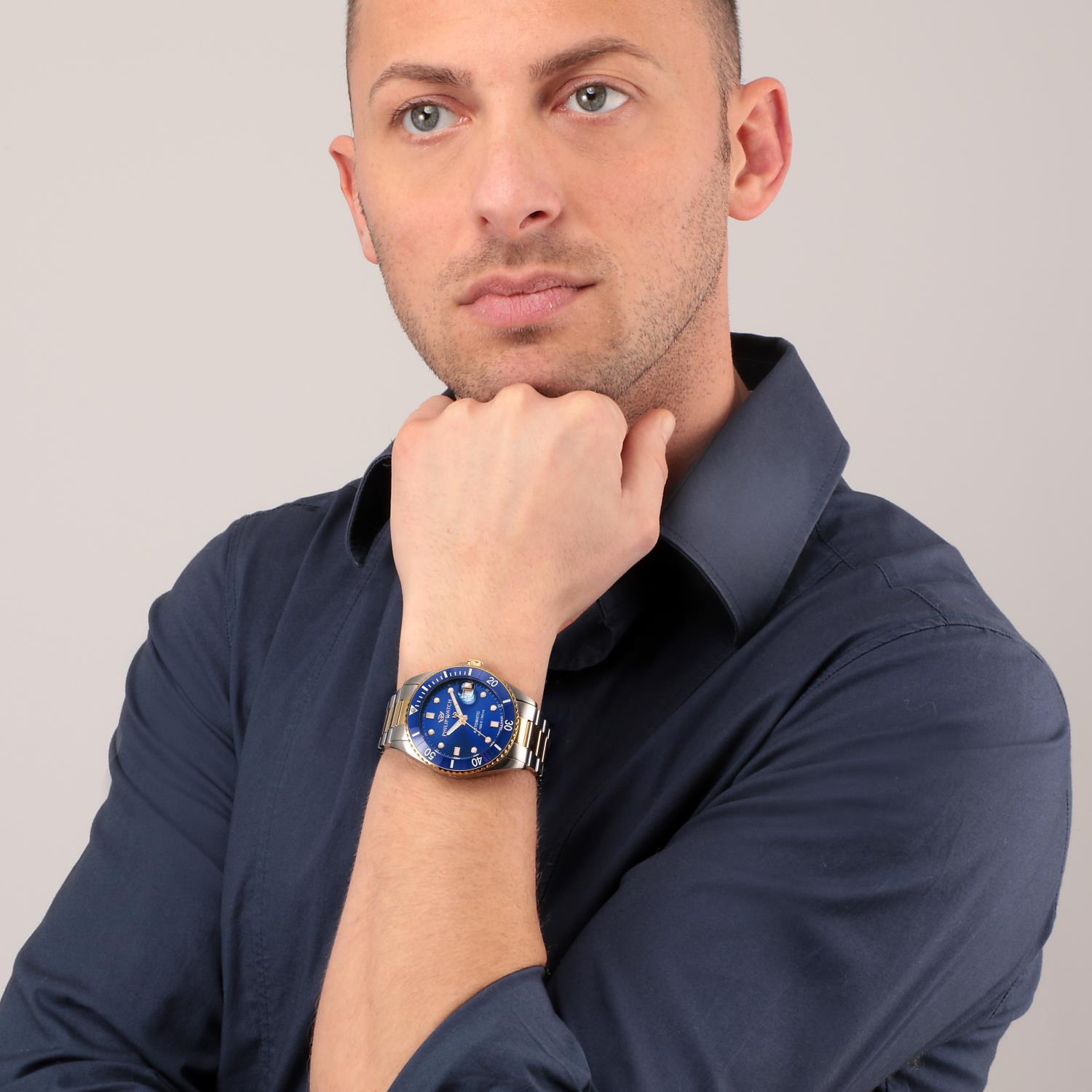 Philip Watch Caribe med en diameter på 42mm, har en lekker kombinasjon av blå, stål og gullfarge.