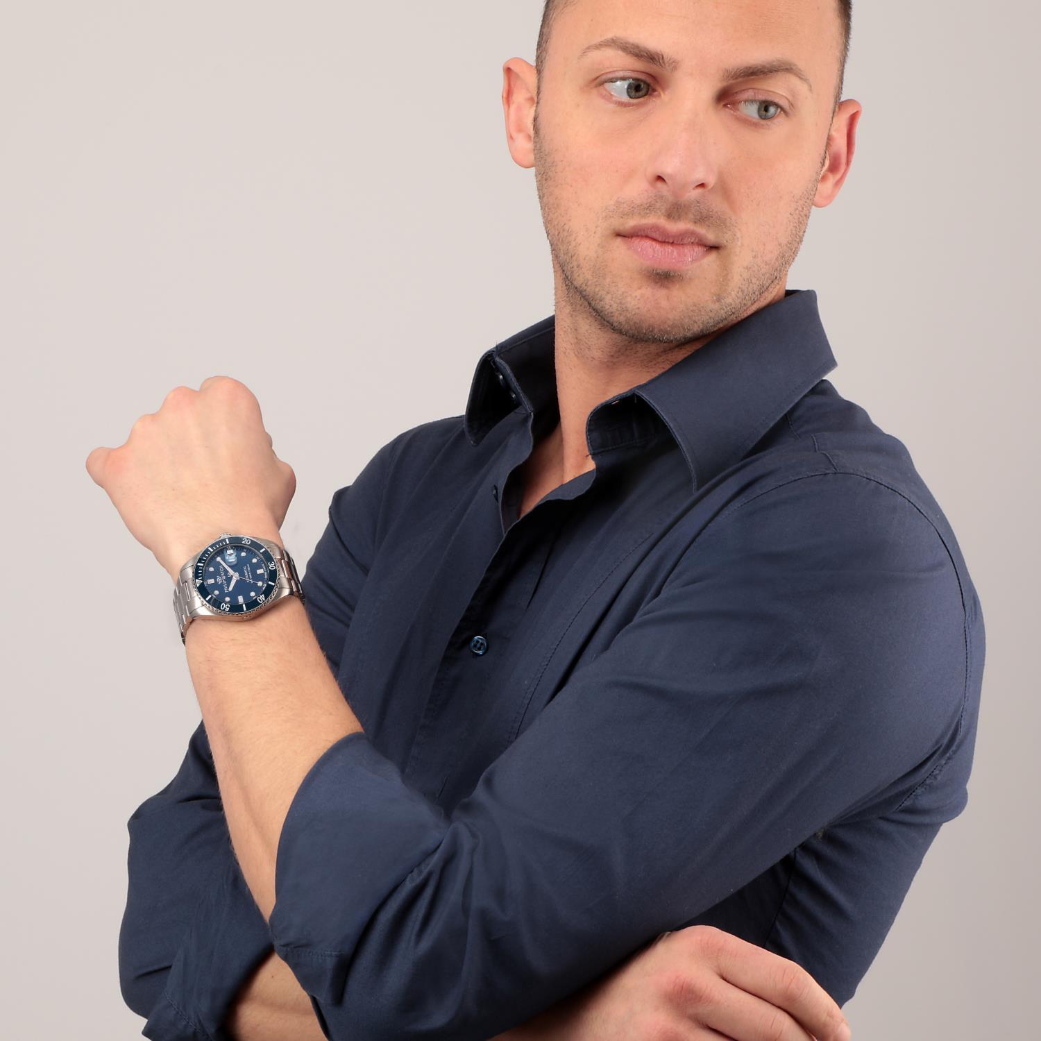 Philip Watch Caribe med en diameter på 42mm, stållenke og blå urskive.