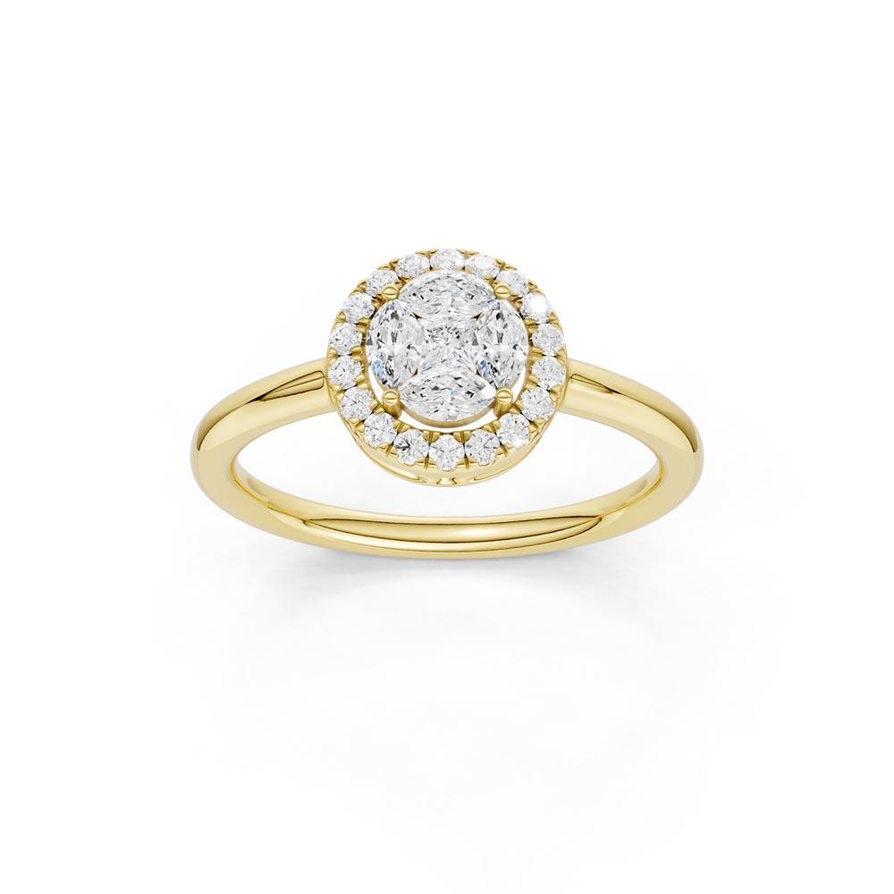 Ring i gultgull 14karat (585) med totalt 0,30ct TWSI diamanter. 1 stor i midten med en ring av mindre rundt.