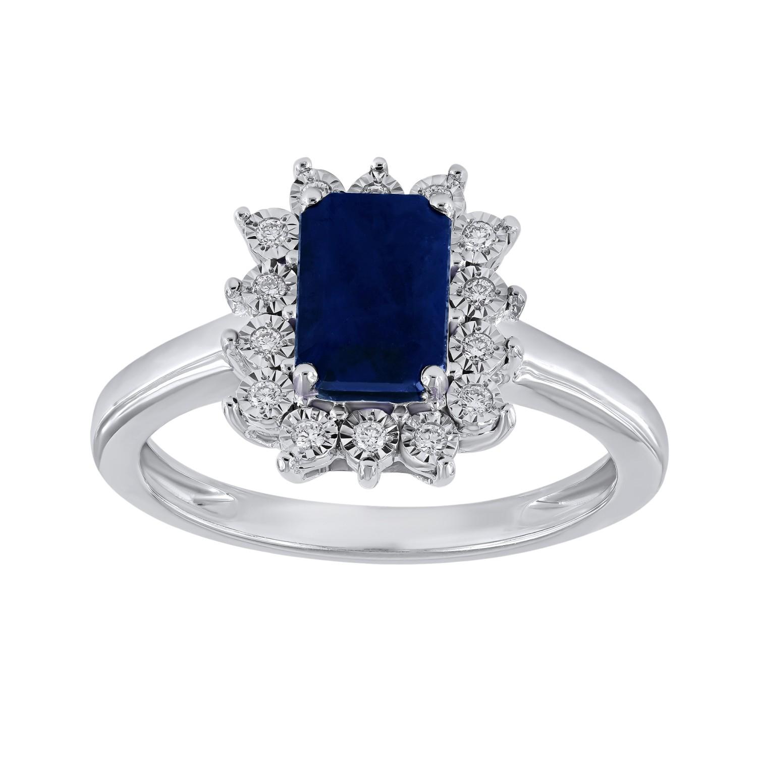 Ring i hvitt gull 14K (585). Rosett med blå firkantet safir på 7,2×5,2mm og totalt 0,08ct TWSI diamanter.