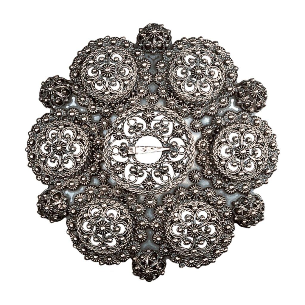 Vakker slangesølje i oksidert sølv omkranset med blanke trådkantløv. Utsøkte detaljrr med kruser, kjørner og demantar.