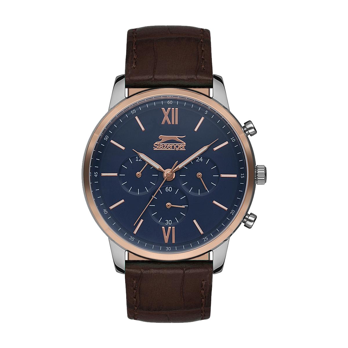 Stilig herreklokke fra Slazenger med brun skinnreim og blå urskive.