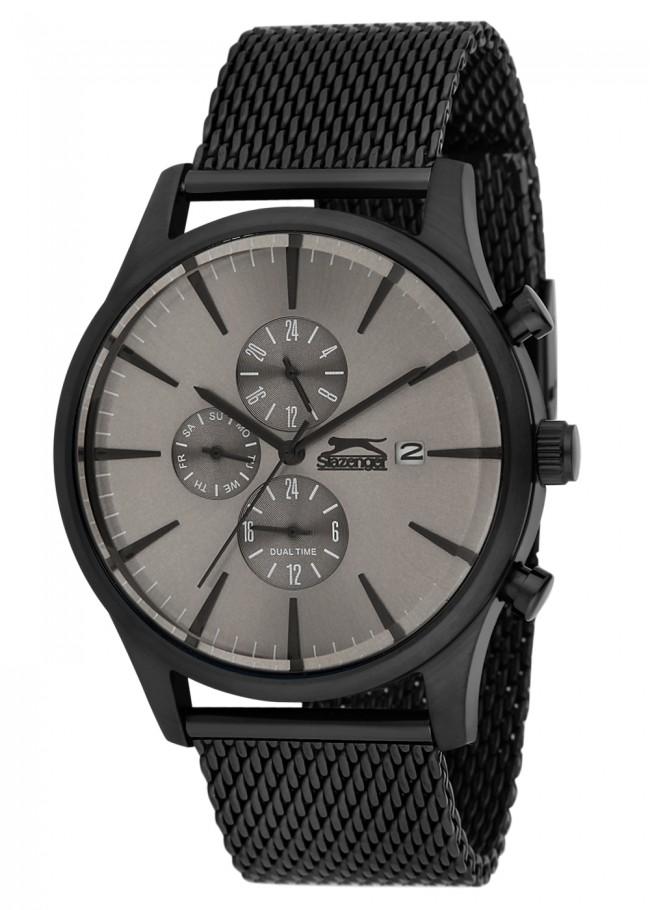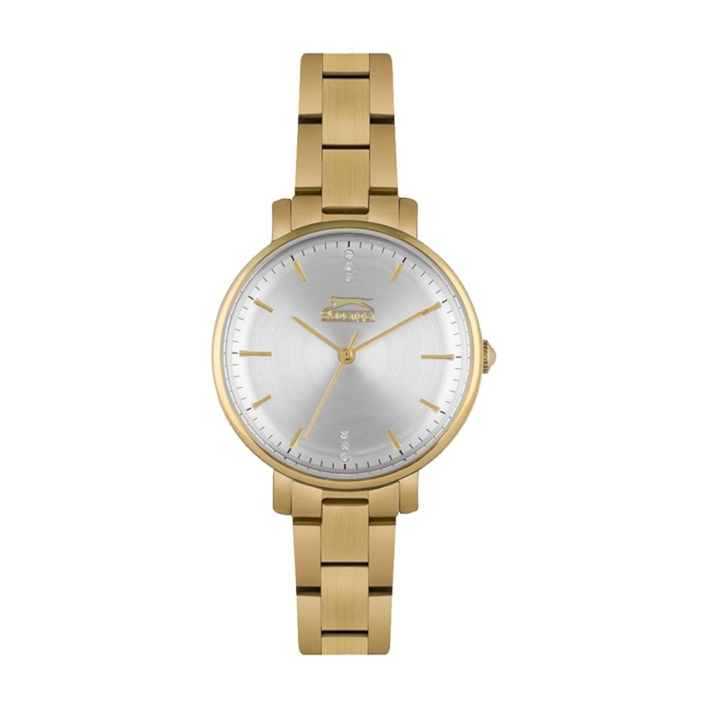 Dameklokke fra Slazenger med gullfarget stållenke og sølvfarget urskive.