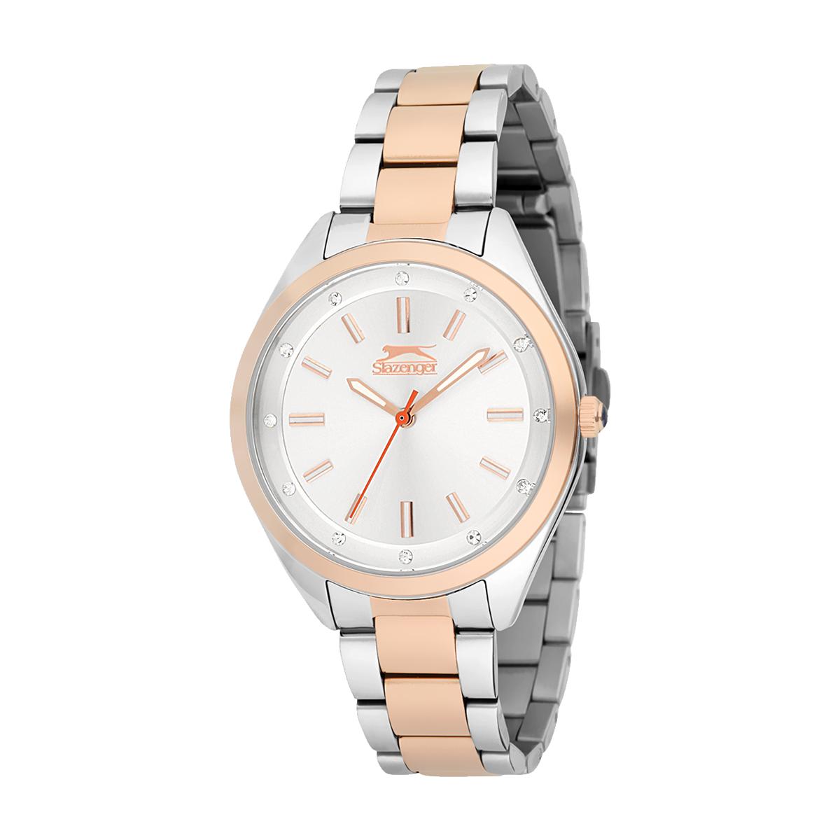 Moteriktig sølvfarget Slazenger klokke med bezel og detaljer i rosé. Klokken har swarovski krystaller på urskiven.