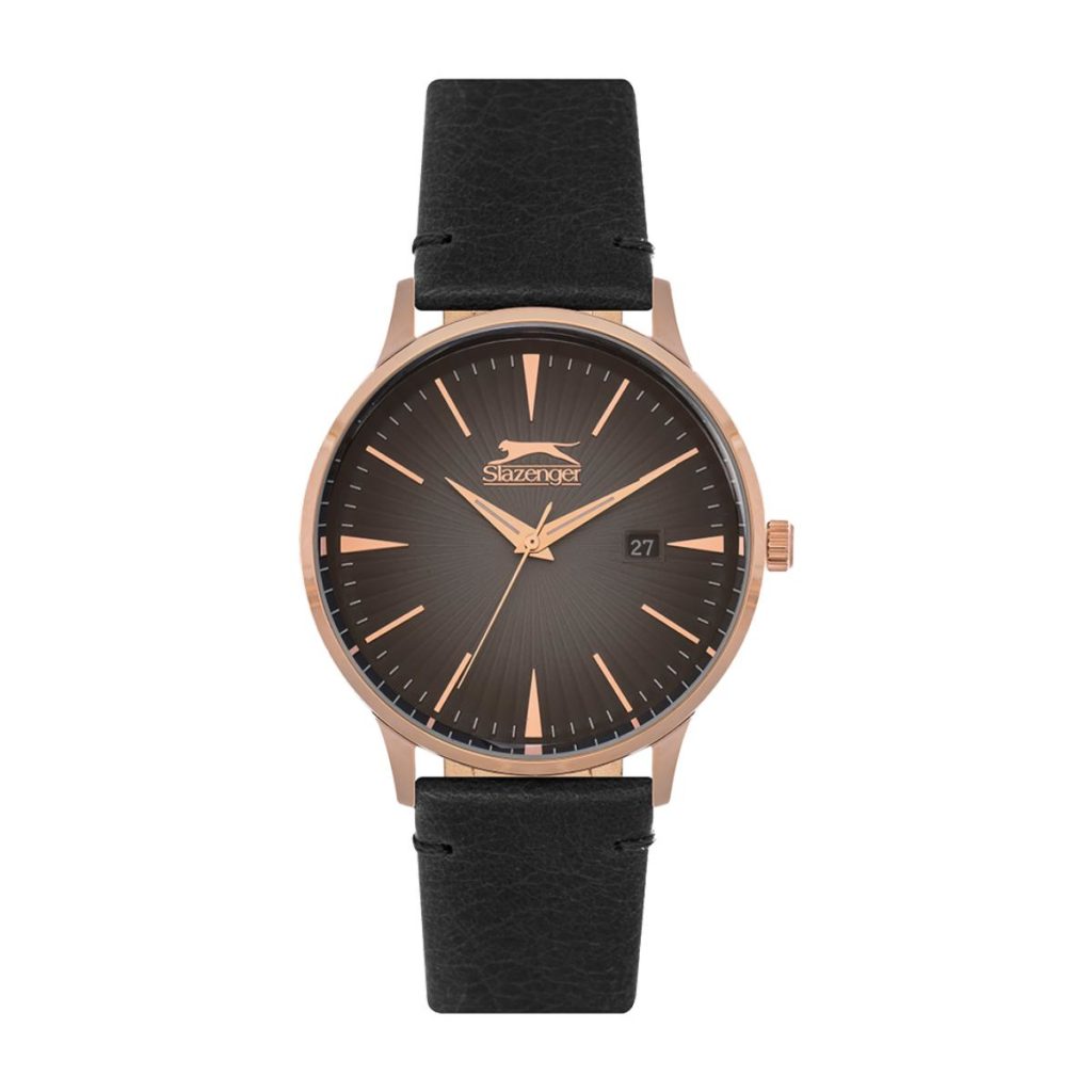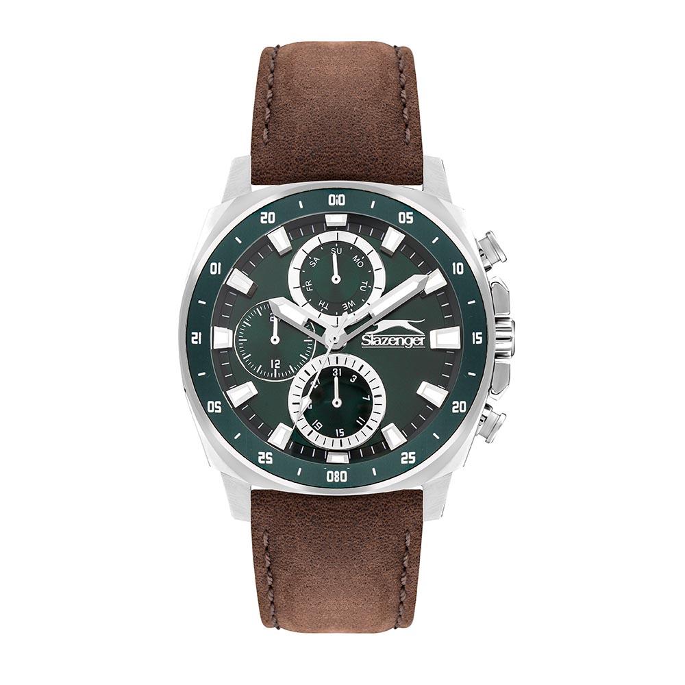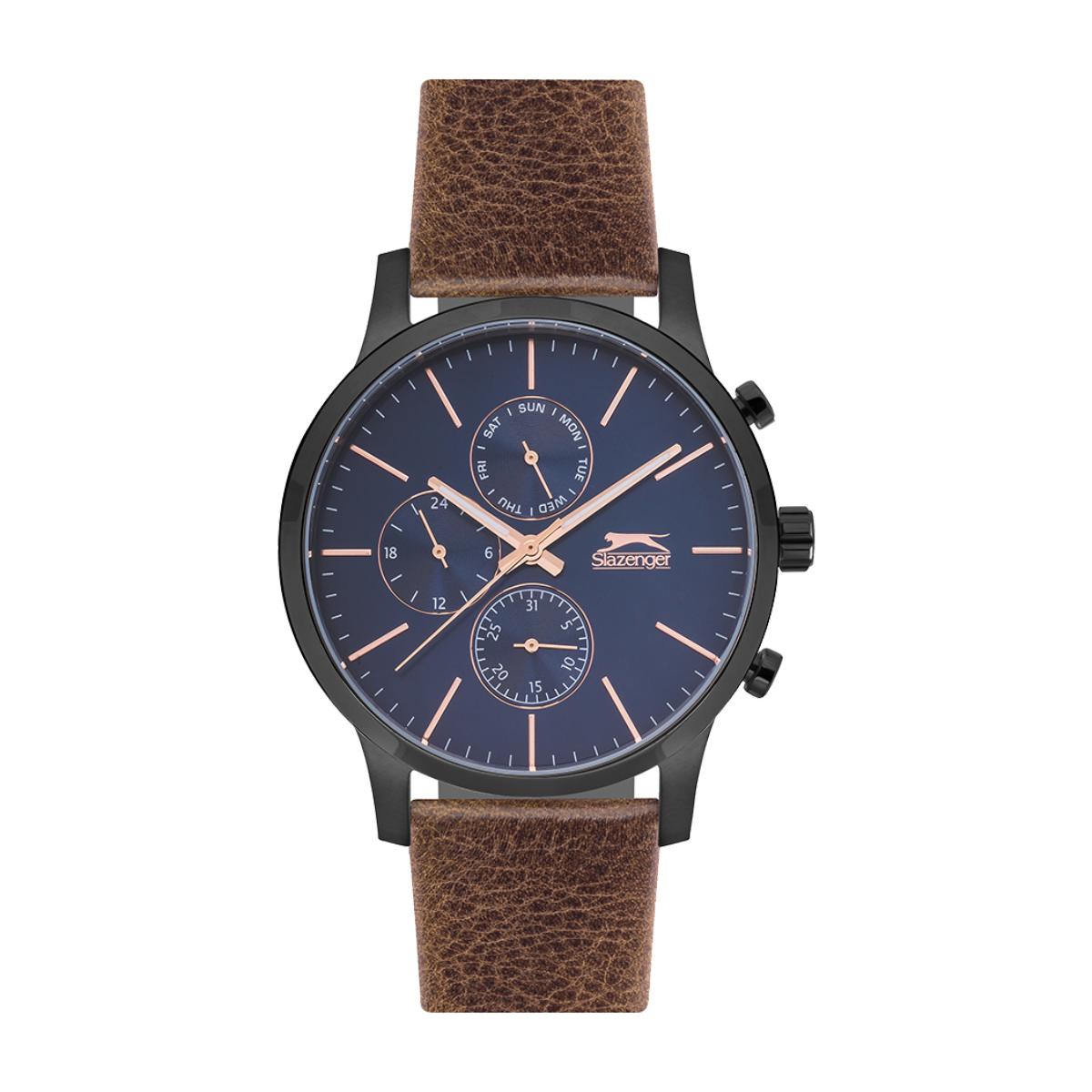 Slazenger klokke med brun skinnreim og blå urskive.