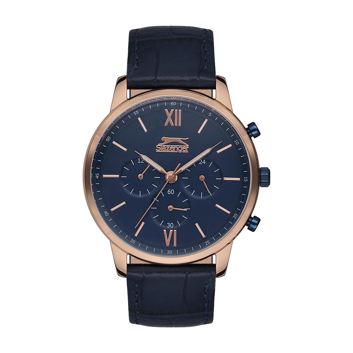 Stilig herreklokke fra Slazenger med svart skinnreim og blå urskive.