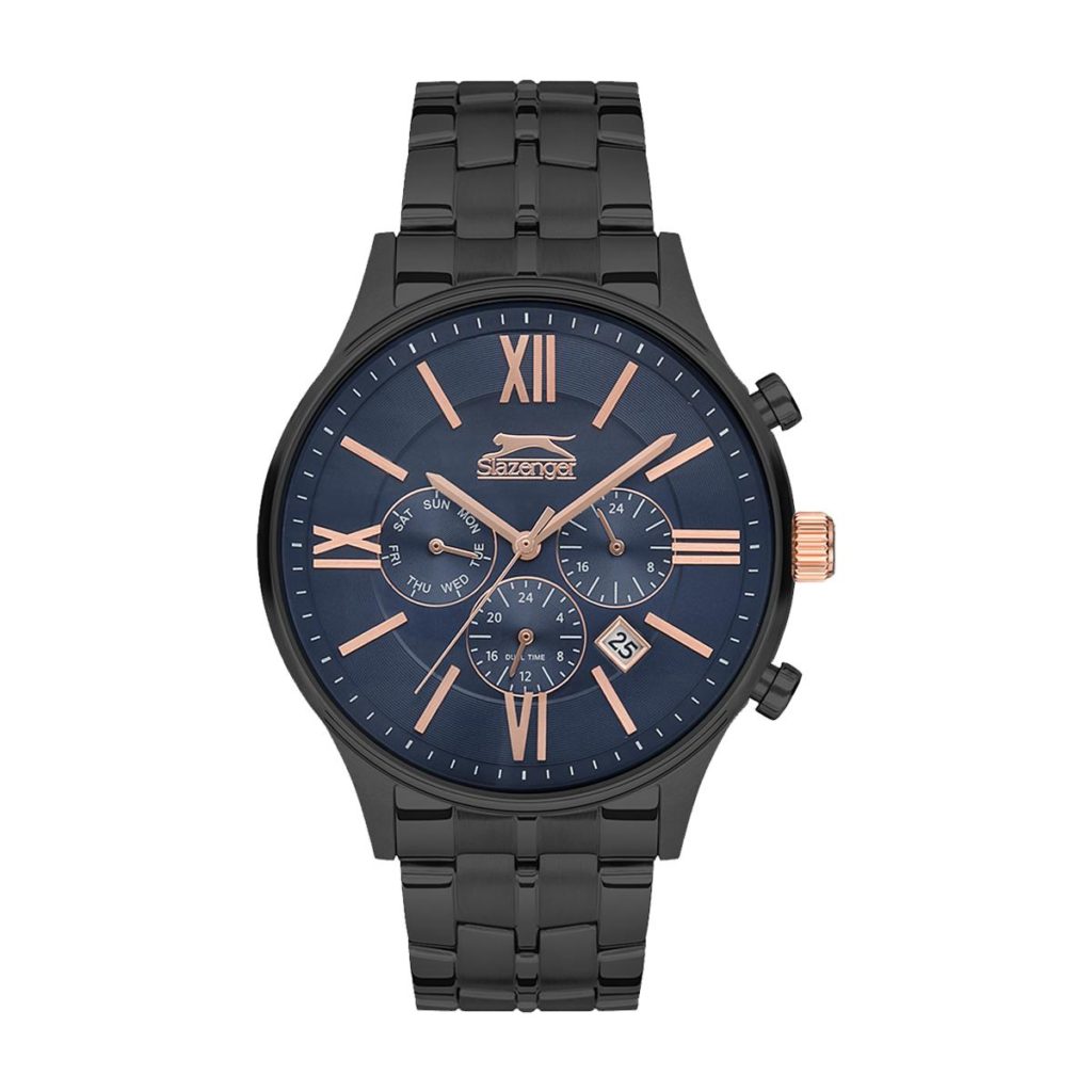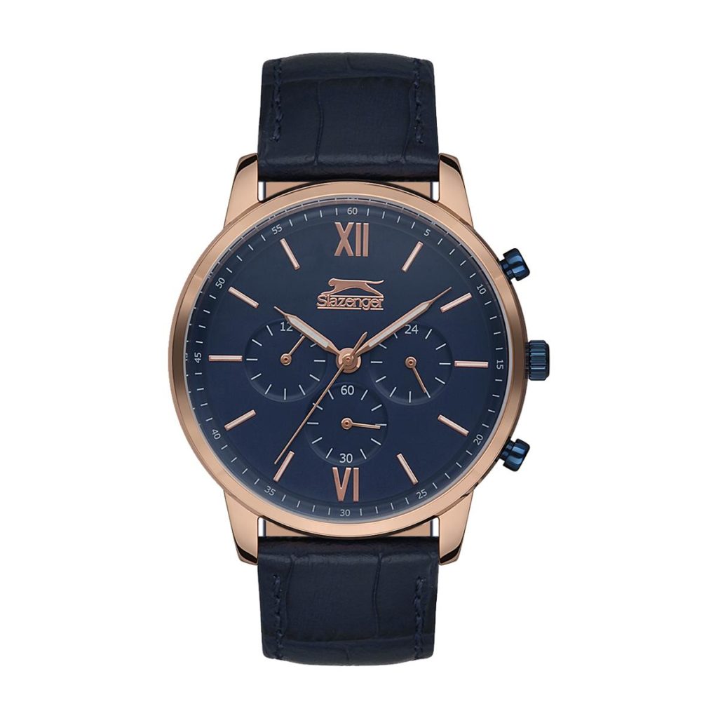 Stilig herreklokke fra Slazenger med svart skinnreim og blå urskive.
