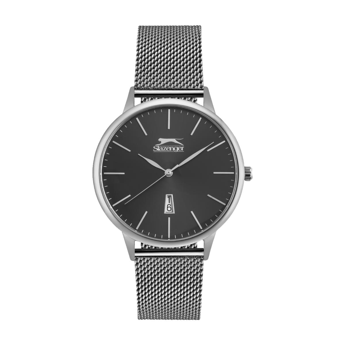 Klassisk herreklokke fra Slazenger med stålfarget meshlenke og svart urskive