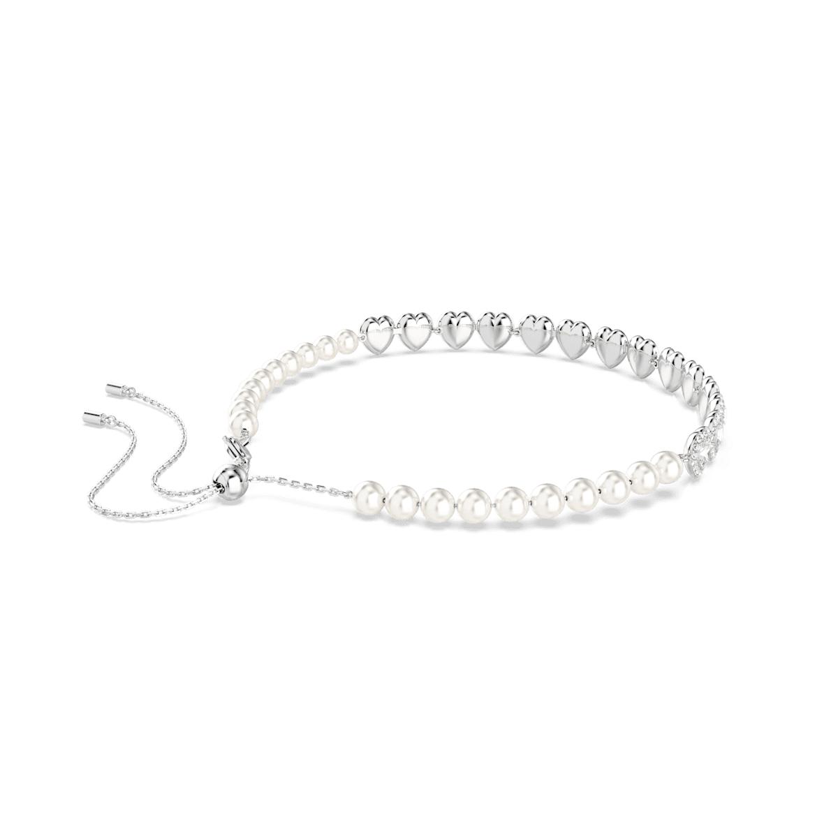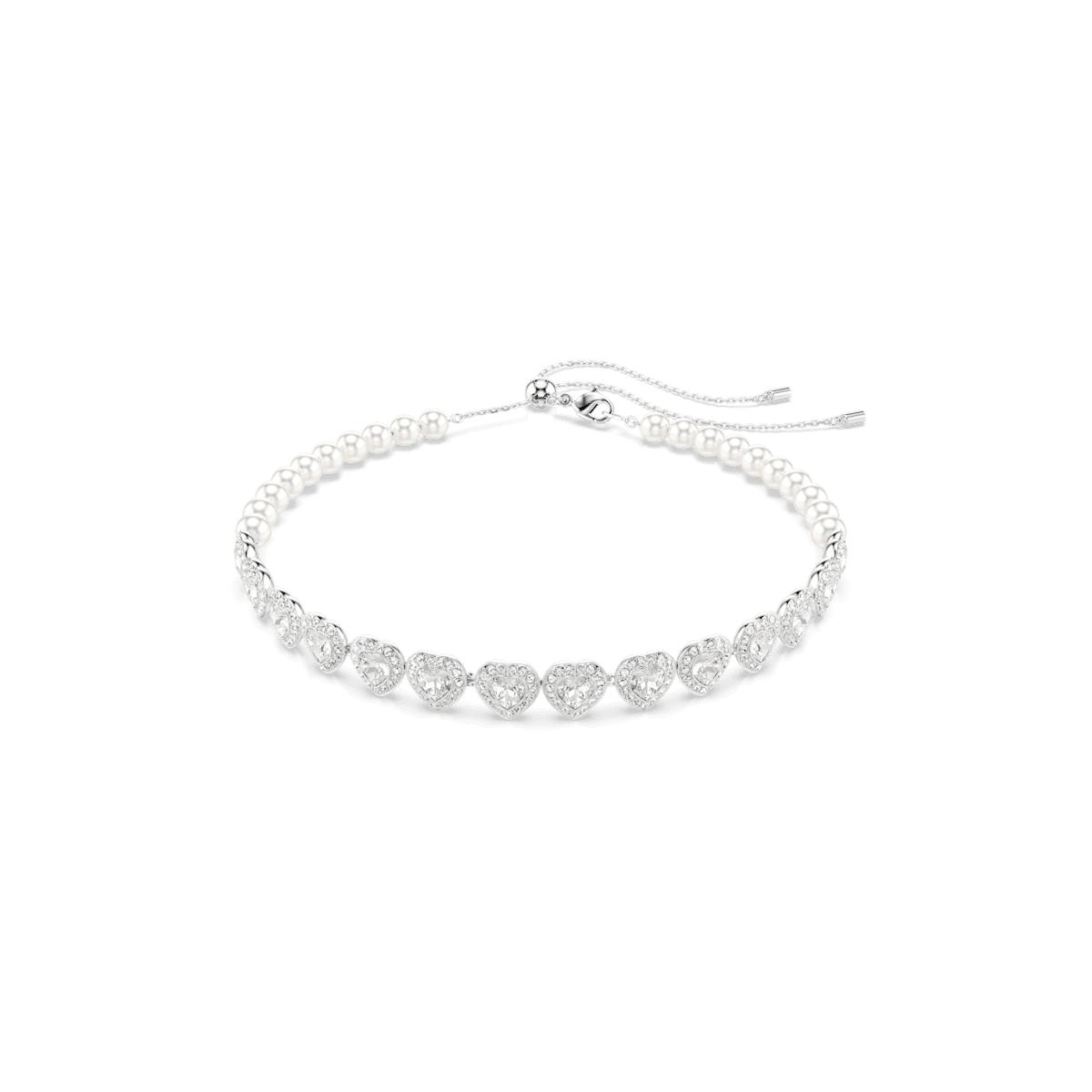 This radiant choker was made for an intense expression of love. The rhodium plated design is partly decorated with luxurious Swarovski Crystal Pearls, while at the front, there is a row of heart-shaped crystals, each surrounded by a glittering halo of clear pavé. A sliding closure at the back means you can adjust the jewelry to your perfect fit. Pair this bold necklace with other matching jewelry to create your own romantic combinations.