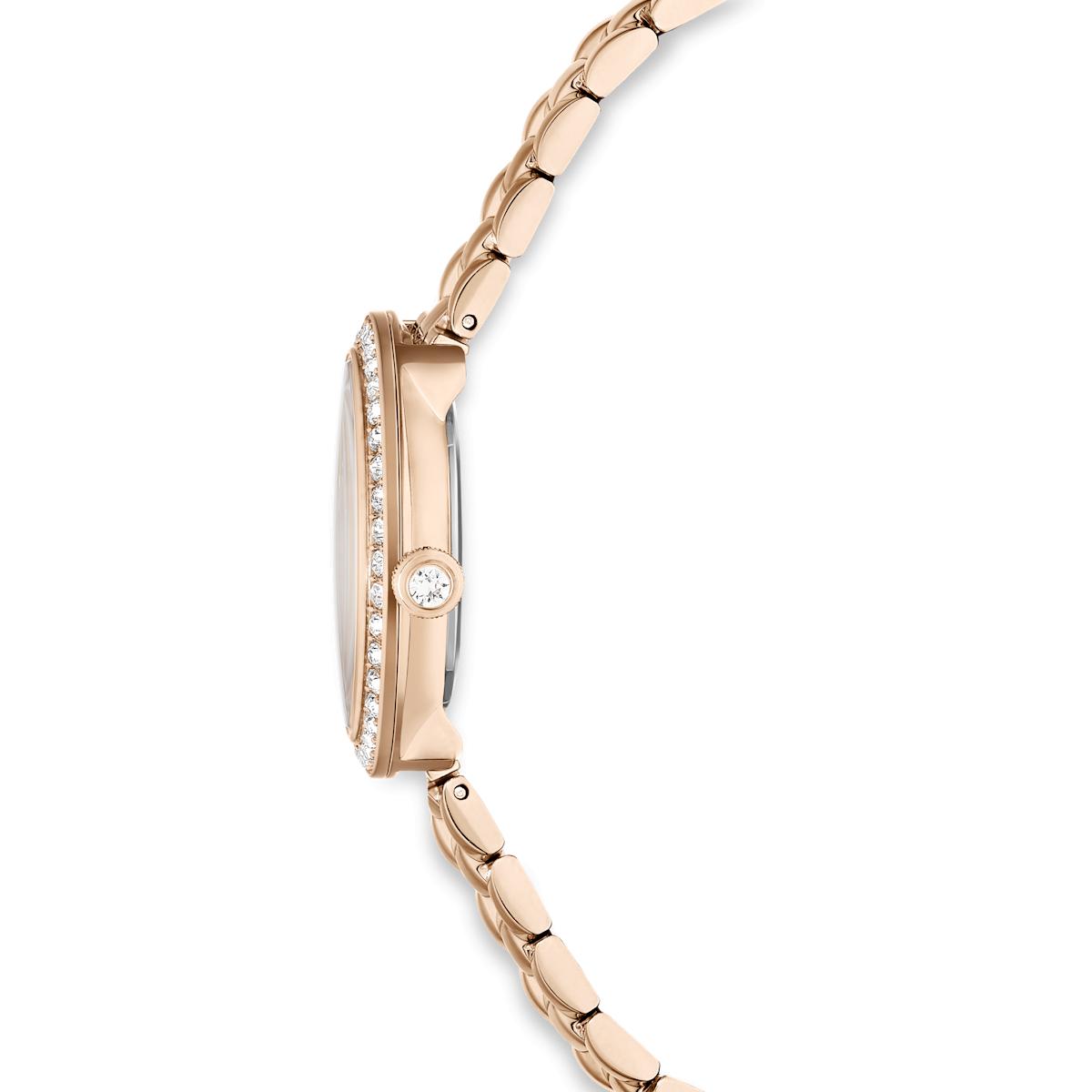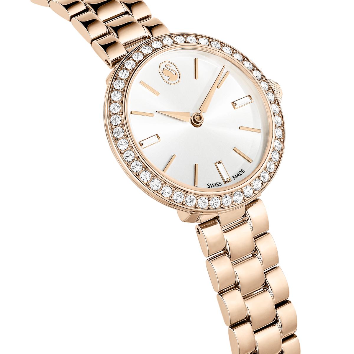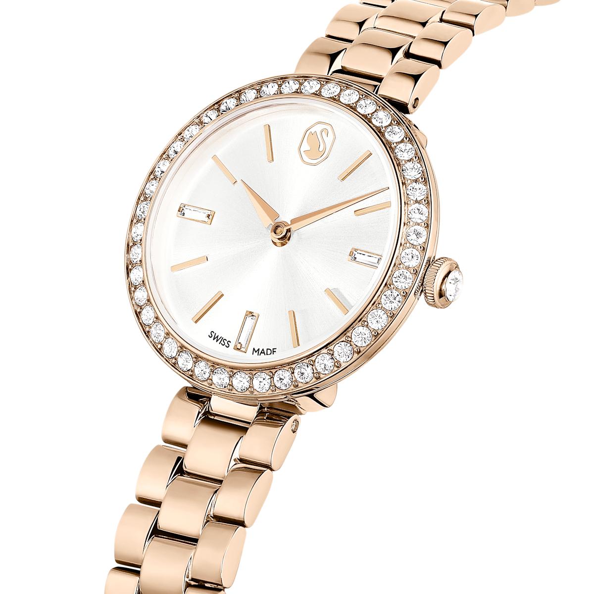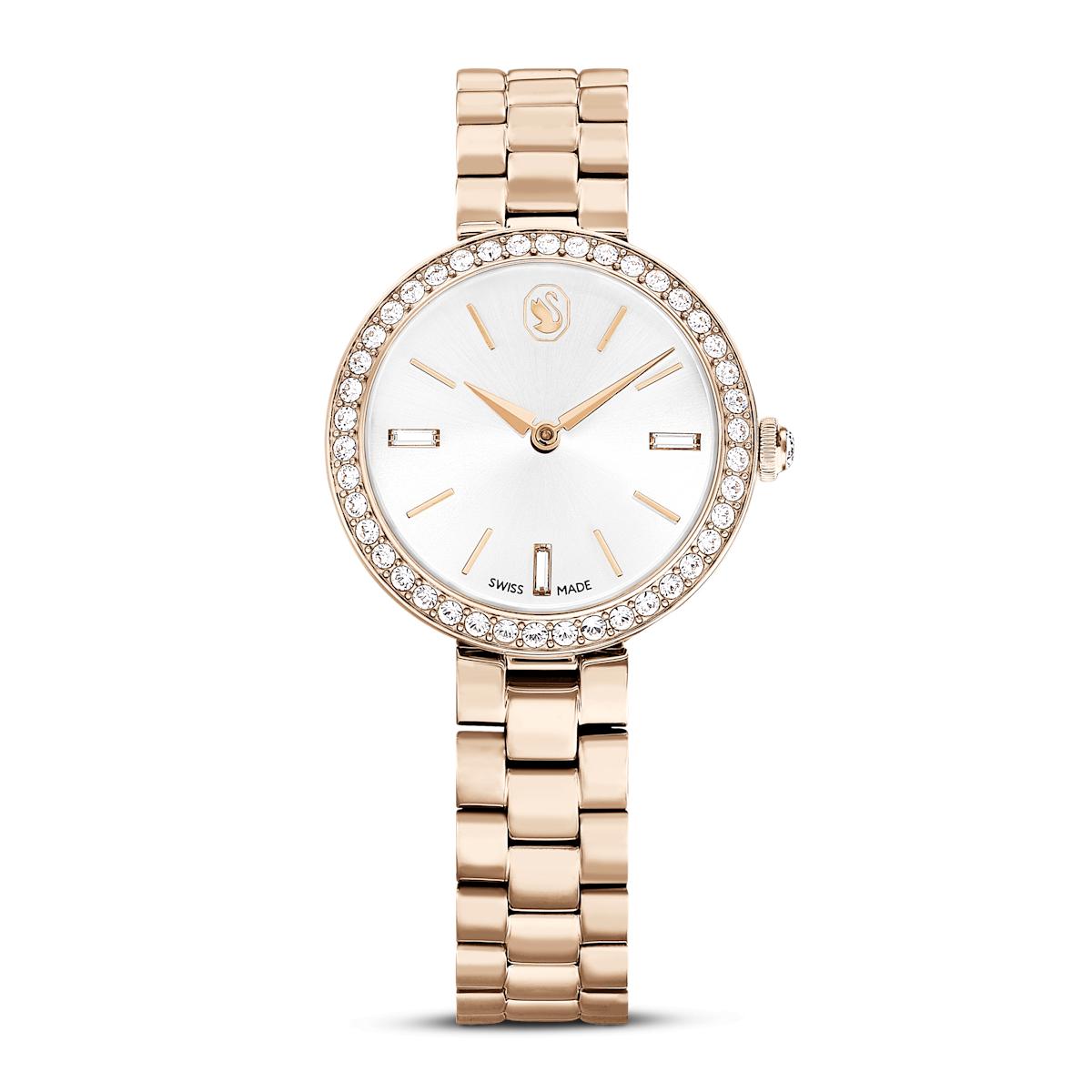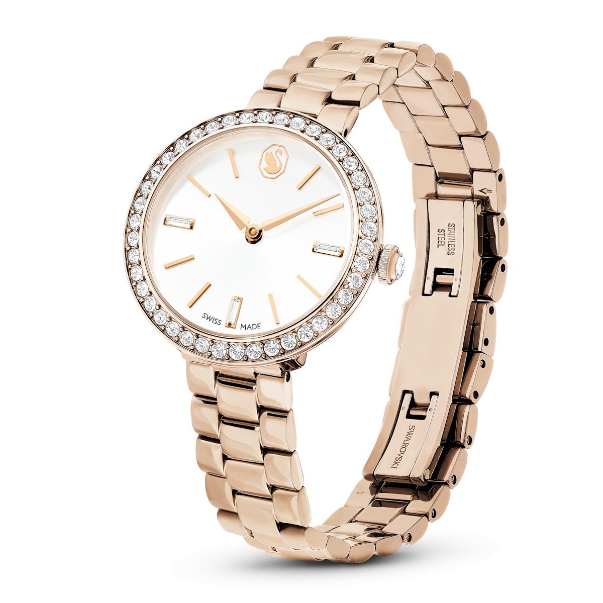 Blending Swarovski radiance with contemporary design, this Certa watch is the perfect fusion of artistry and functionality. The 30mm stainless steel case has a warm champagne gold-tone finish and a bezel set with a shimmering pavé of 42 crystals. On the radiant sunray dial, there is an elegant swan logo at 12 o’clock, along with three index markers crafted from individual baguette-cut crystals. A single crystal is set within the crown, while the three-link metal bracelet provides a comfortable fit around the wrist. This Swiss made watch is water resistant to 50 meters and is an elegant choice to complement your everyday style.