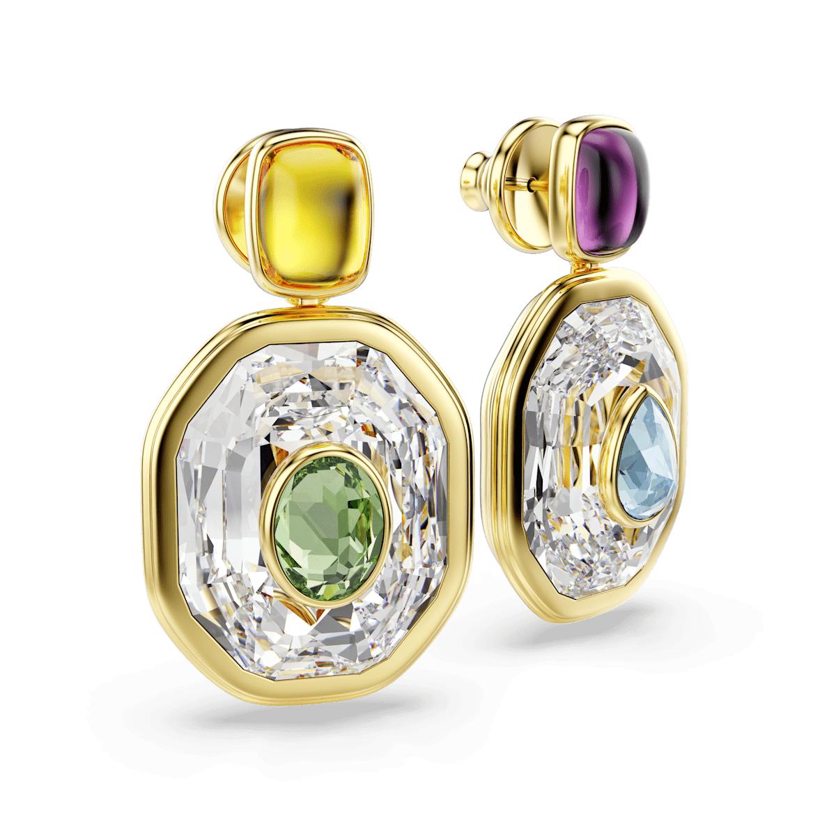 With their bold blend of colors and shapes, these pierced Chroma earrings take creativity to the next level. Each gold-tone plated piece attaches to the ear with crystals in purple or yellow. Beneath, the octagon-shaped motifs are presented with a green oval-cut crystal or a blue pear-cut crystal, stacked on top of larger clear crystals. Immerse yourself in the captivating details, and wear alongside matching Chroma pieces to maximize the joy.