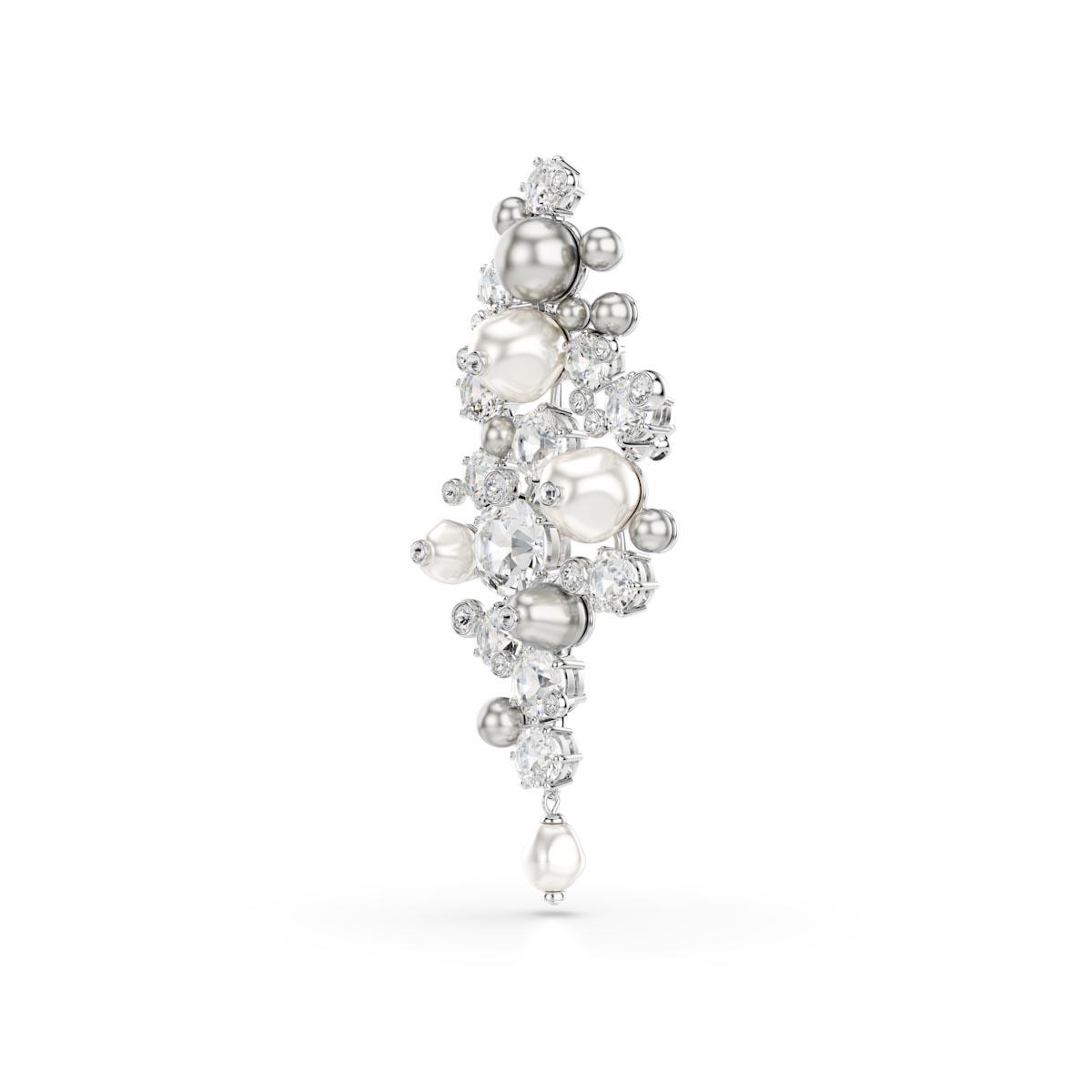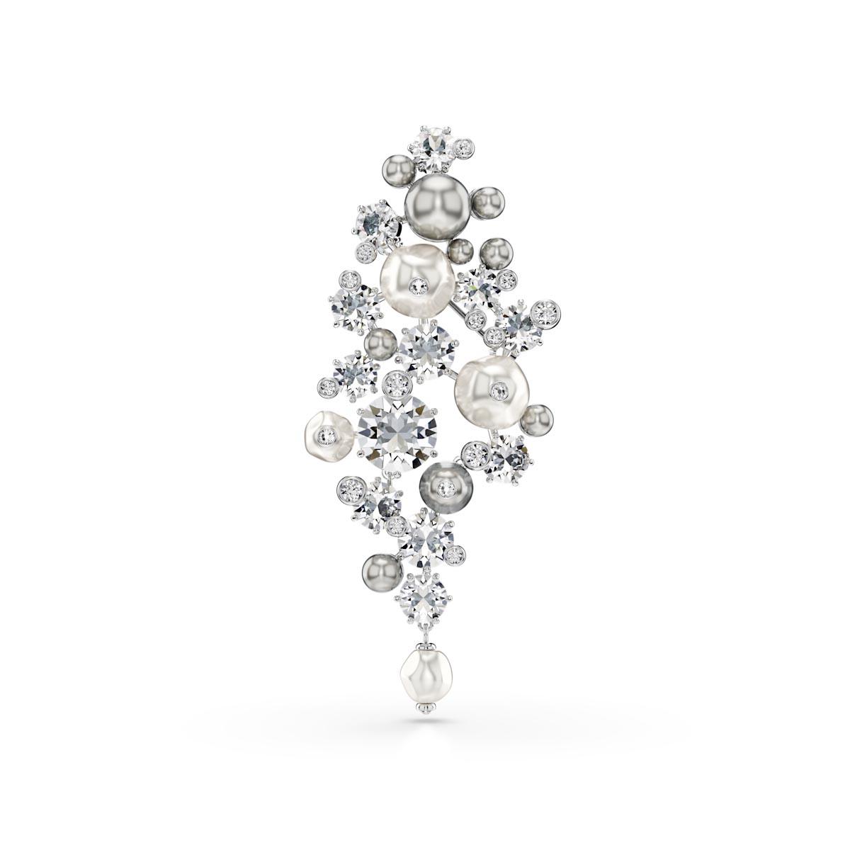 Embrace the cosmic side of your style with this starlike brooch in rhodium plating. The dramatic silhouette reveals a cluster of clear crystals and white and gray Swarvoski Crystal Pearls, meticulously brought together in a style that is complex yet harmonious. Wear this brooch alongside the matching earrings or choker to maximize the stellar effect.