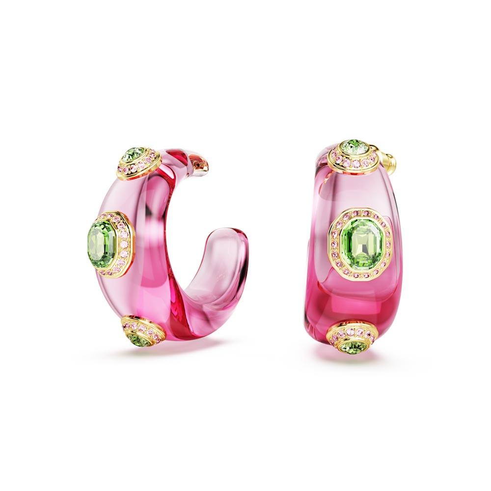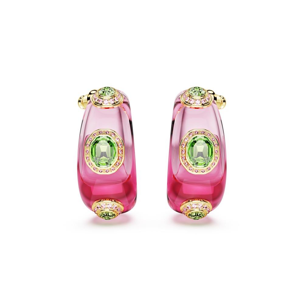 These vibrant Dulcis earrings were made for instant color impact. Each candy-inspired piece features an open pink hoop, with one octagon- and two round-cut green crystals surrounded by glittering pavé in gold-tone plated frames. A playful way to dress up your style and face the day with infinite energy.