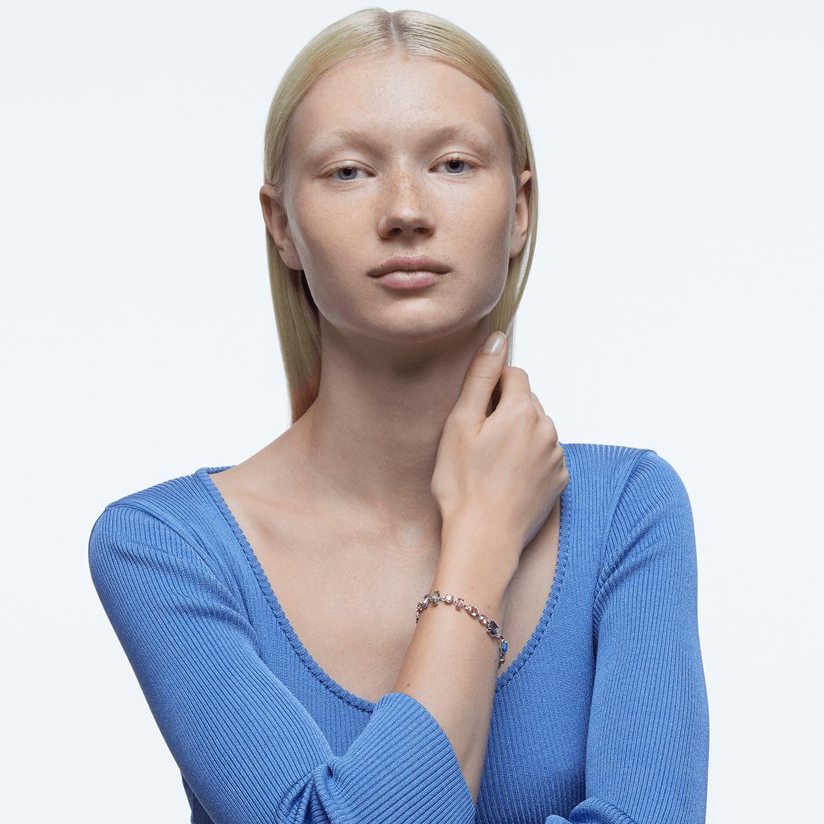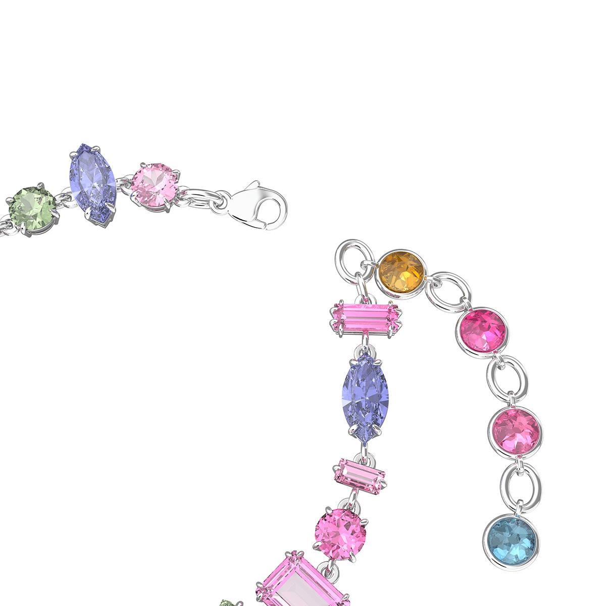 This bracelet is expertly formed from a dazzling array of crystals in mixed, classic cuts and pastel shades, assembled in an unexpected formation. Finished with a rhodium-plated setting, this bracelet is a joyful and vibrant statement, whether worn alone or with the matching necklace from the Gema family. This bracelet is part of the Gema family, designed by Creative Director Giovanna Engelbert for Collection III.