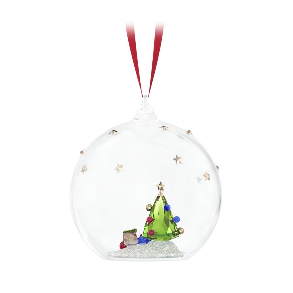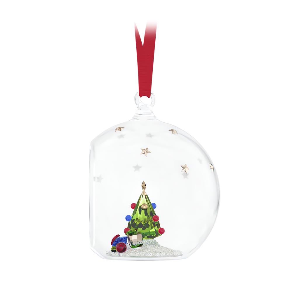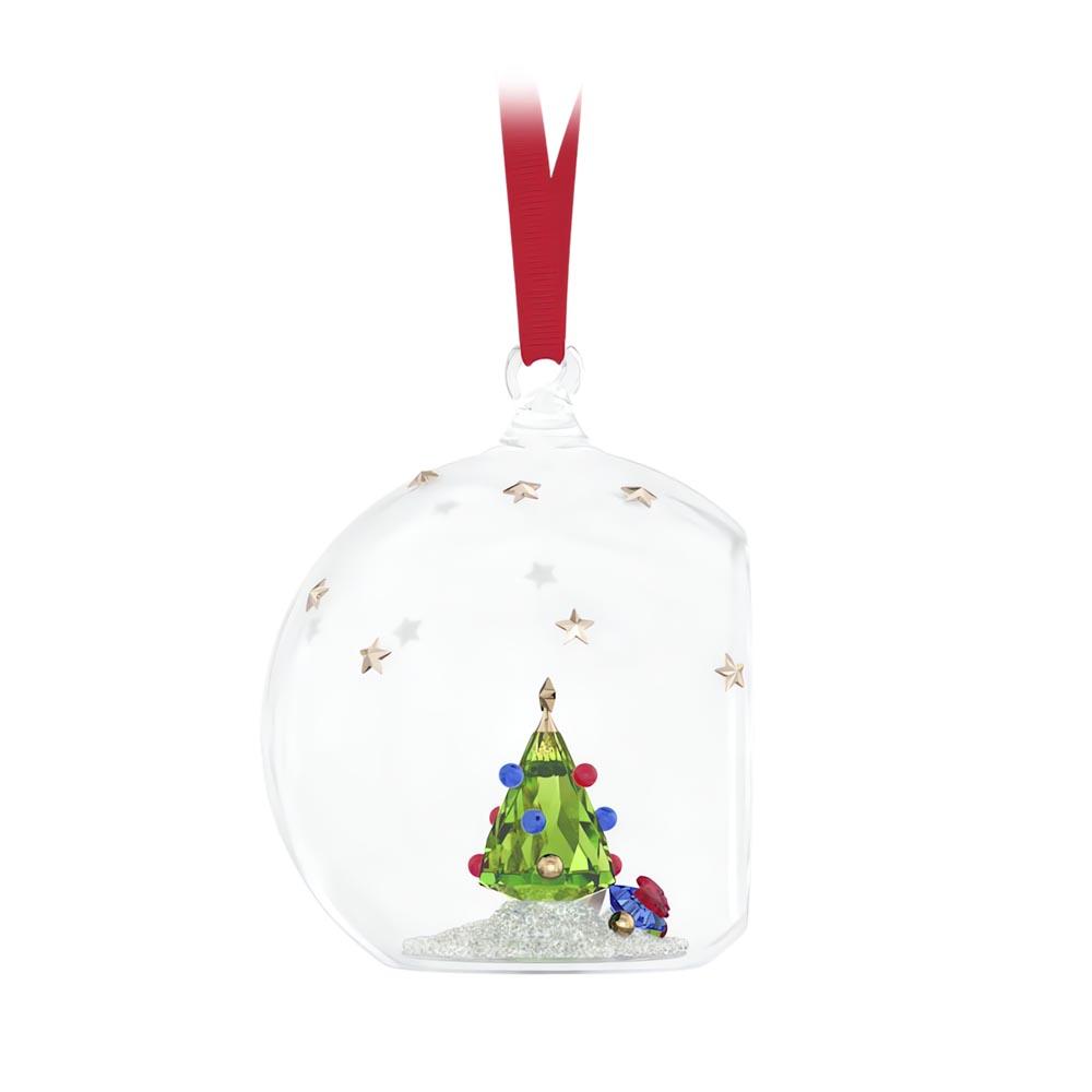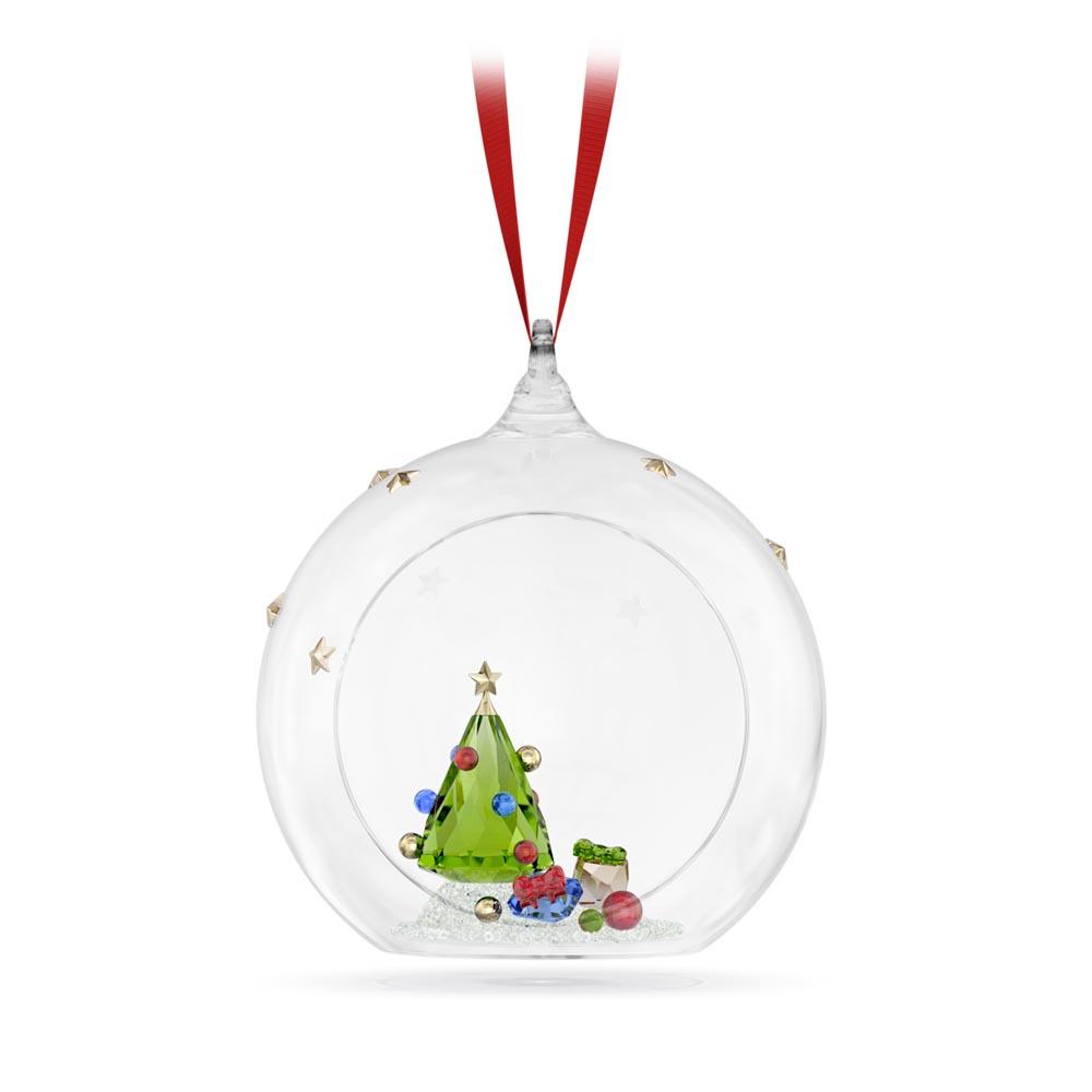 Depicting a joyful holiday scene, this heartwarming ornament is sure to ignite your childhood memories. The ball hangs from a red grosgrain ribbon and contains several wrapped gifts next to a radiant green tree. It is precisely crafted with 412 facets in multiple colors with gold-tone metal accents. Display somewhere special for a touch of traditional festive cheer. Decoration object. Not a toy. Not suitable for children under 15.