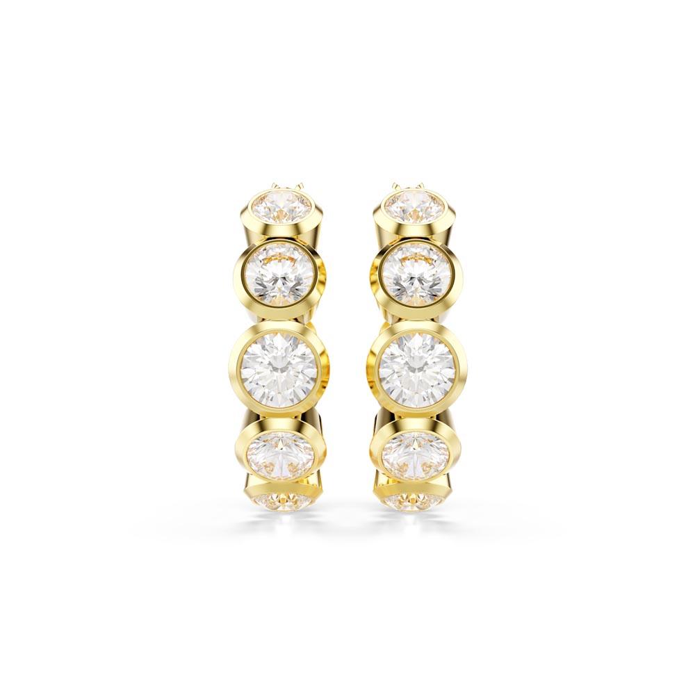 Maximize your elegance with these radiant mini hoops. The gold-tone plated pieces are masterfully crafted with a circle of round-cut Swarovski Zirconia, each placed in a modern bezel setting and presented in a gradient of sizes. A perfect pair for everyday sophistication, or a glowing choice for evening glamour.