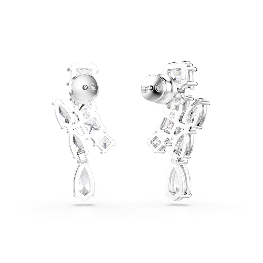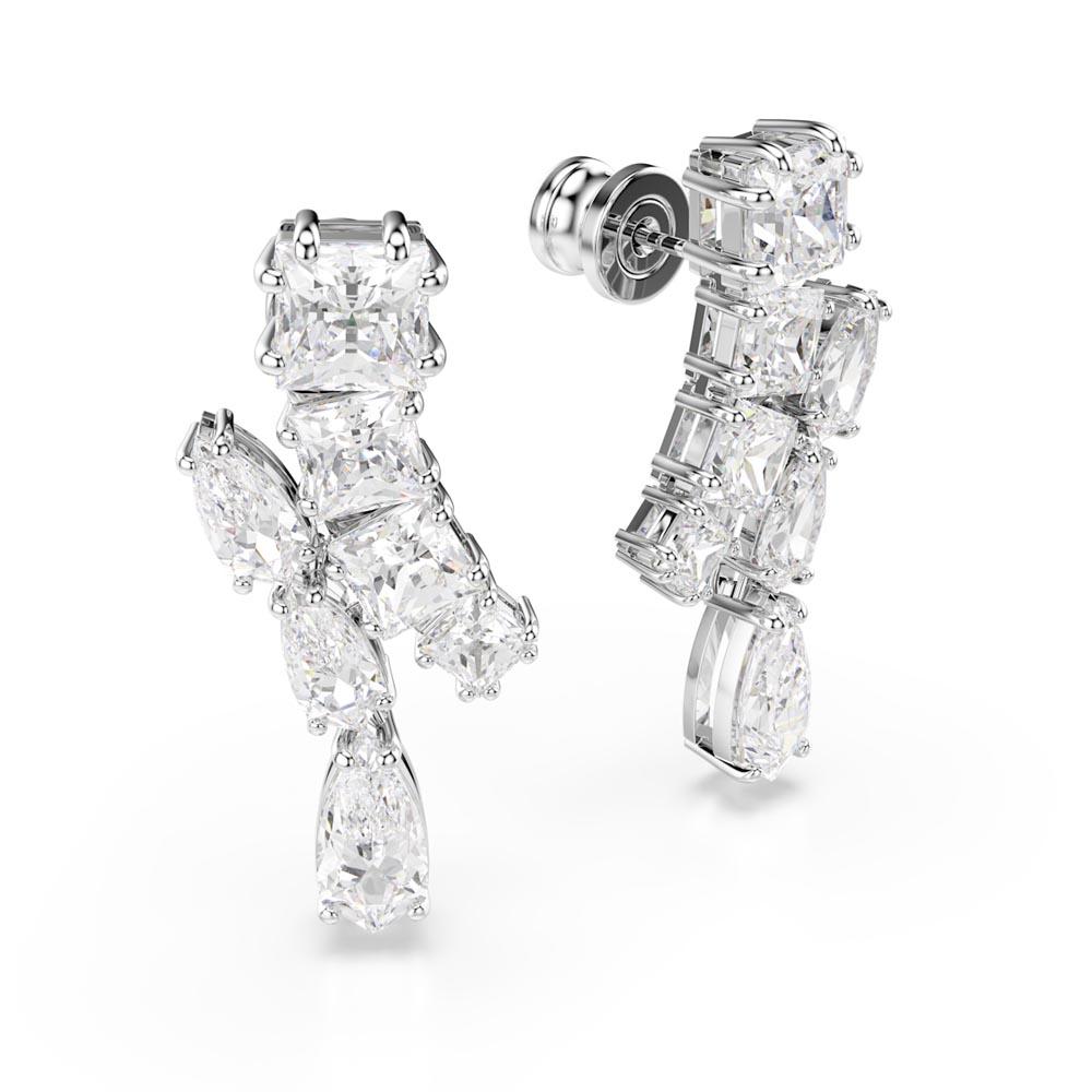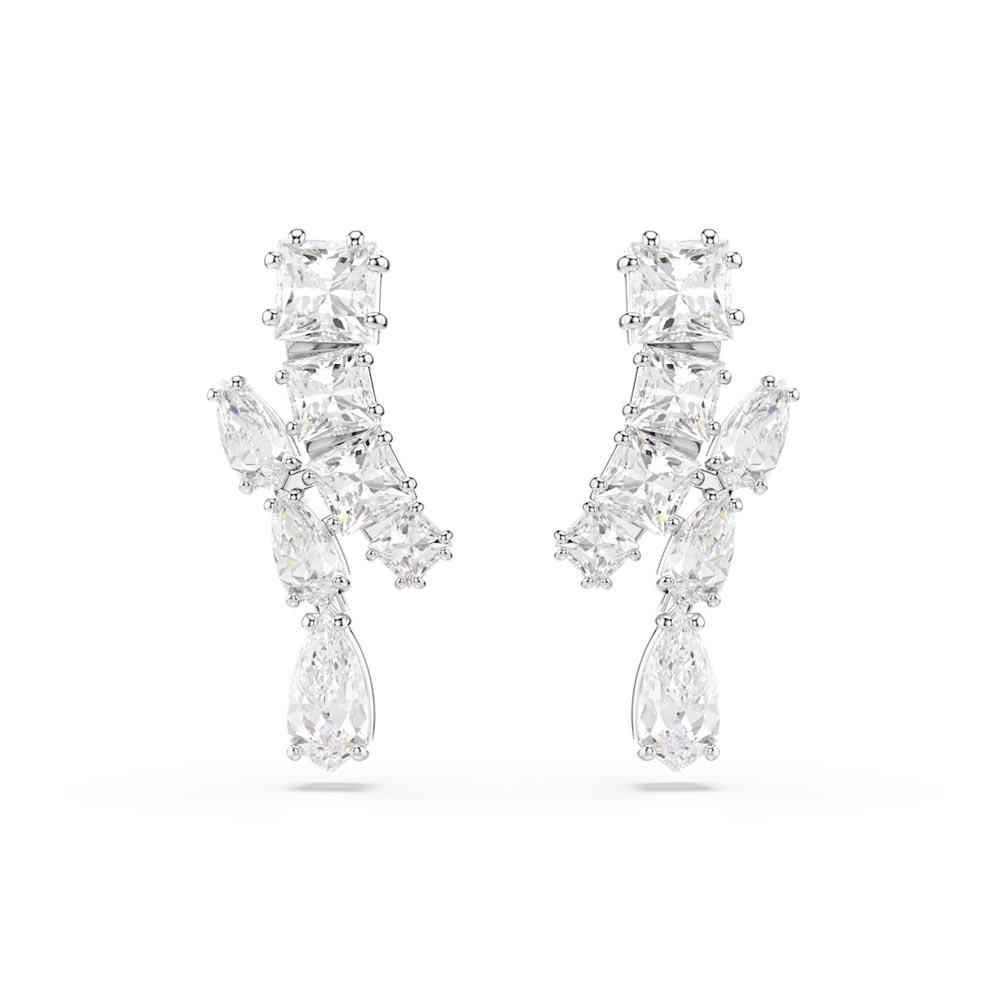 These dynamic pierced earrings shimmer with energetic radiance. Each piece is rhodium plated and adorned with a variety of prong-set Swarovski Zirconia in different cuts. The standout suspended element ensures the light reflects from every angle. Pair this set with a matching Matrix pendant for elegant everyday styling.