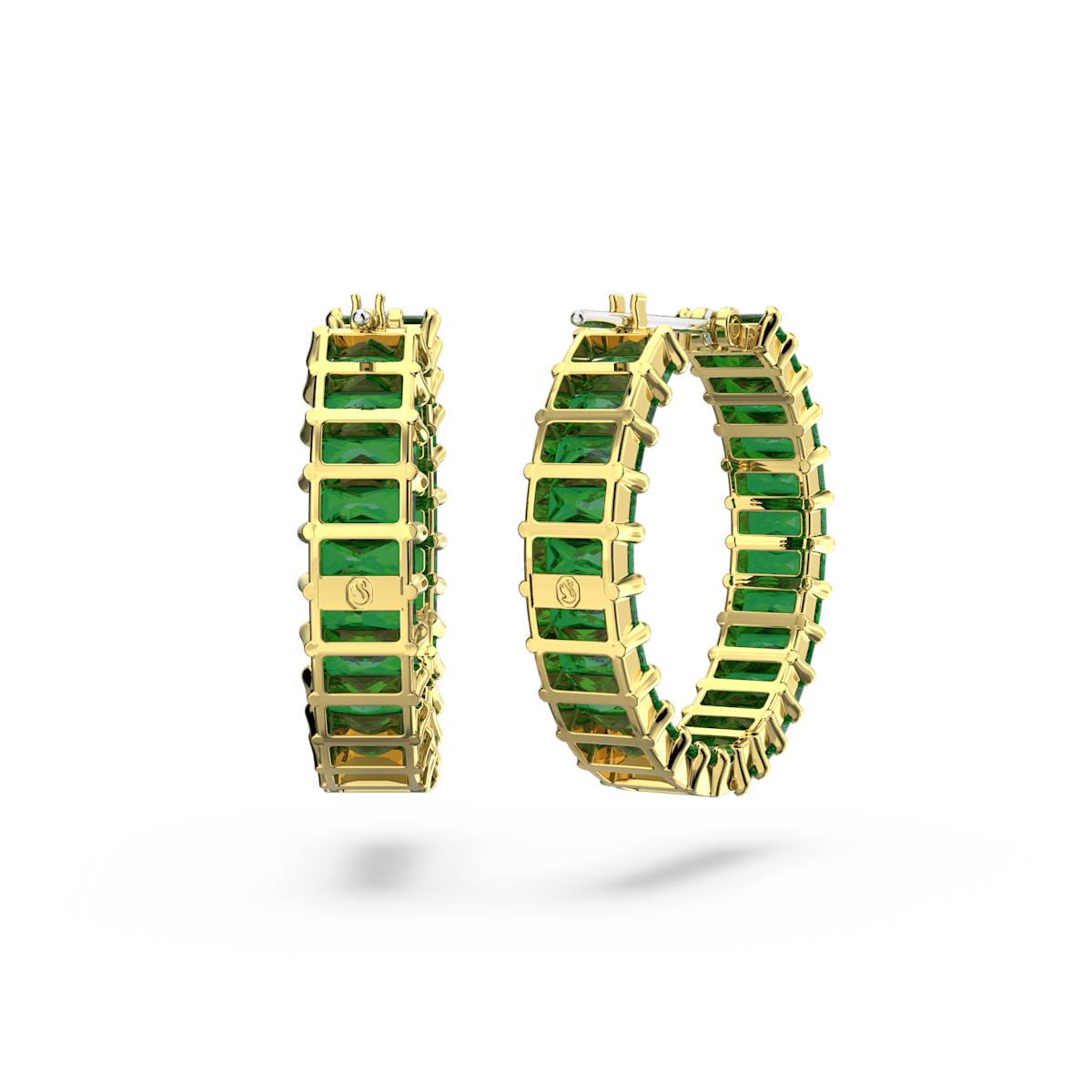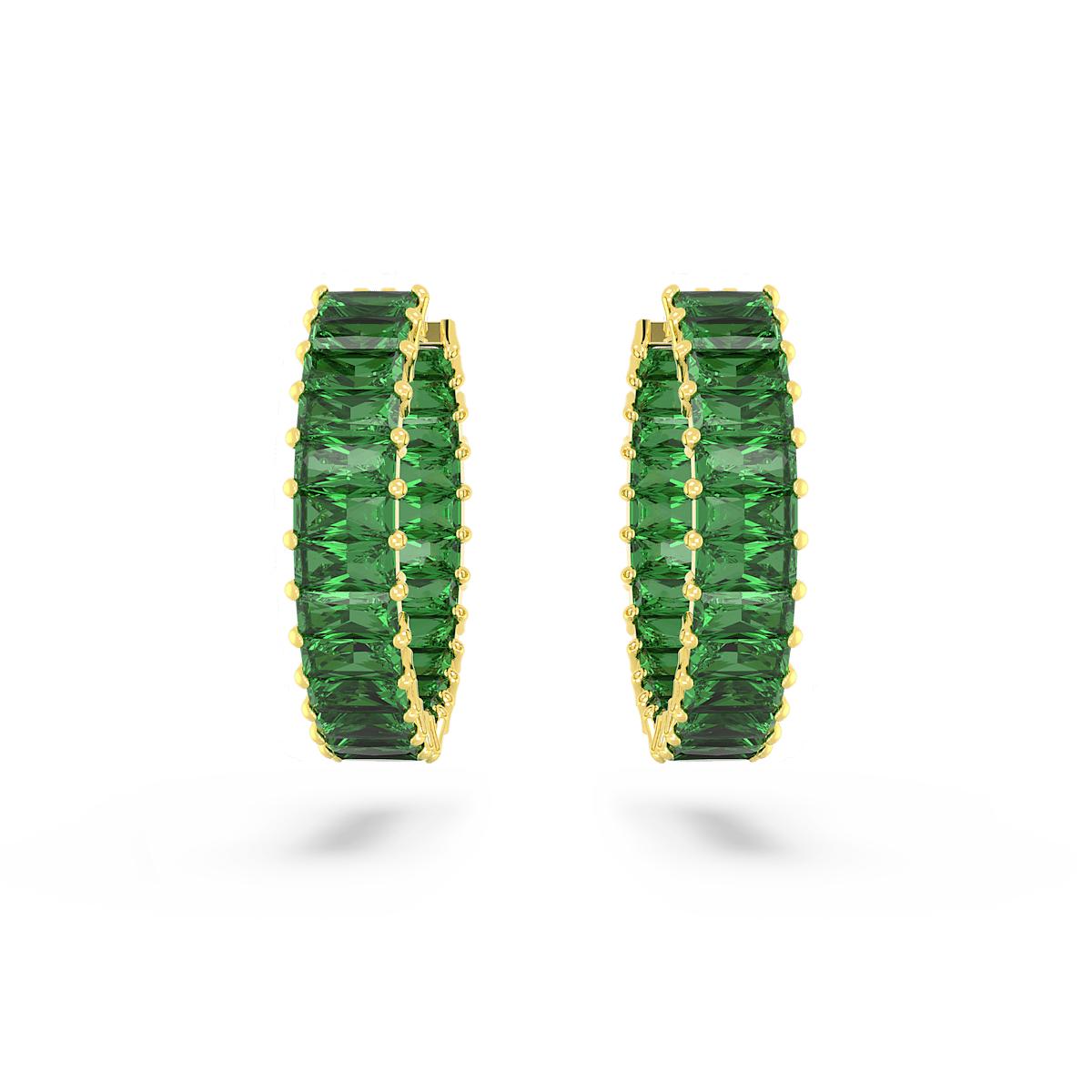 Surround your style in crystals with these striking Matrix earrings, which give the hoop design a dazzling standard of detail. Each gold-tone plated piece features a circle of baguette princess-cut stones in a deep green tone held together with a refined prong setting. This design is just the right amount of mesmerizing. Wear them with everything.