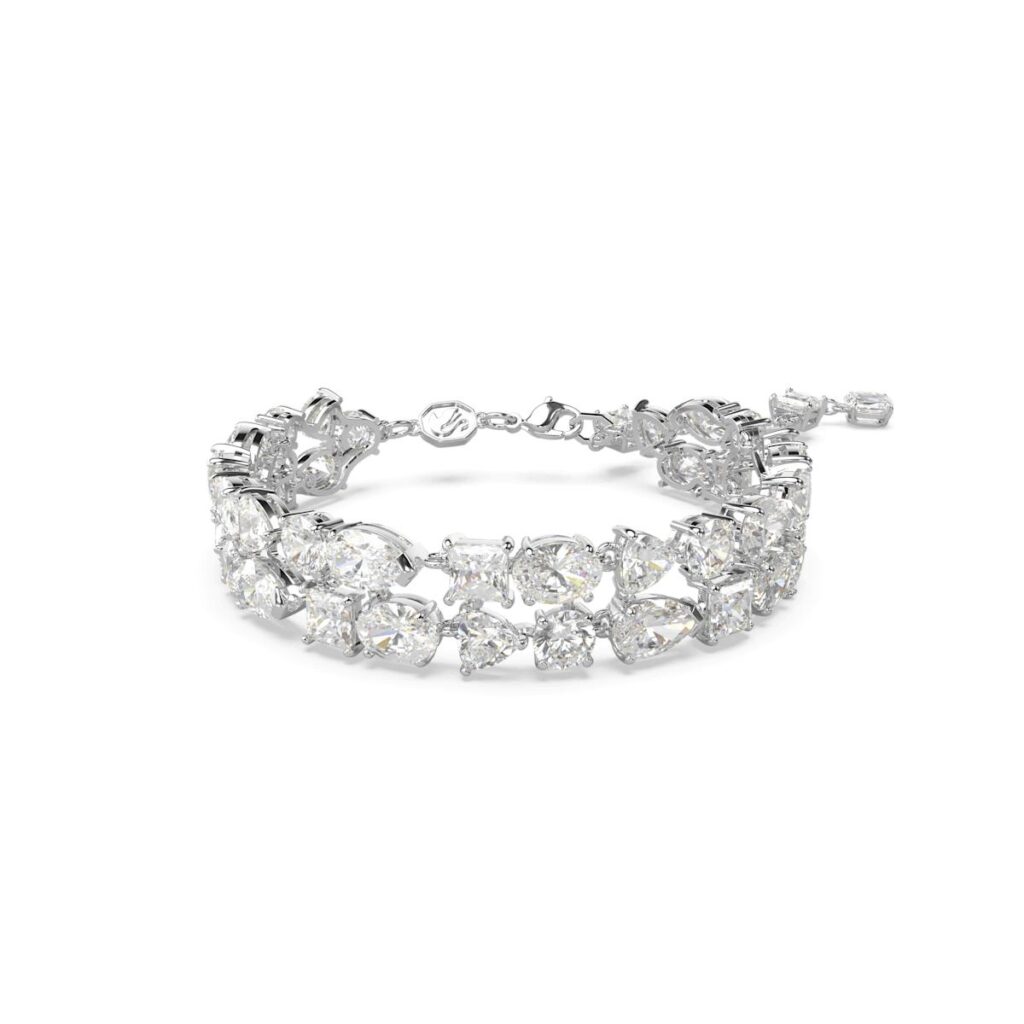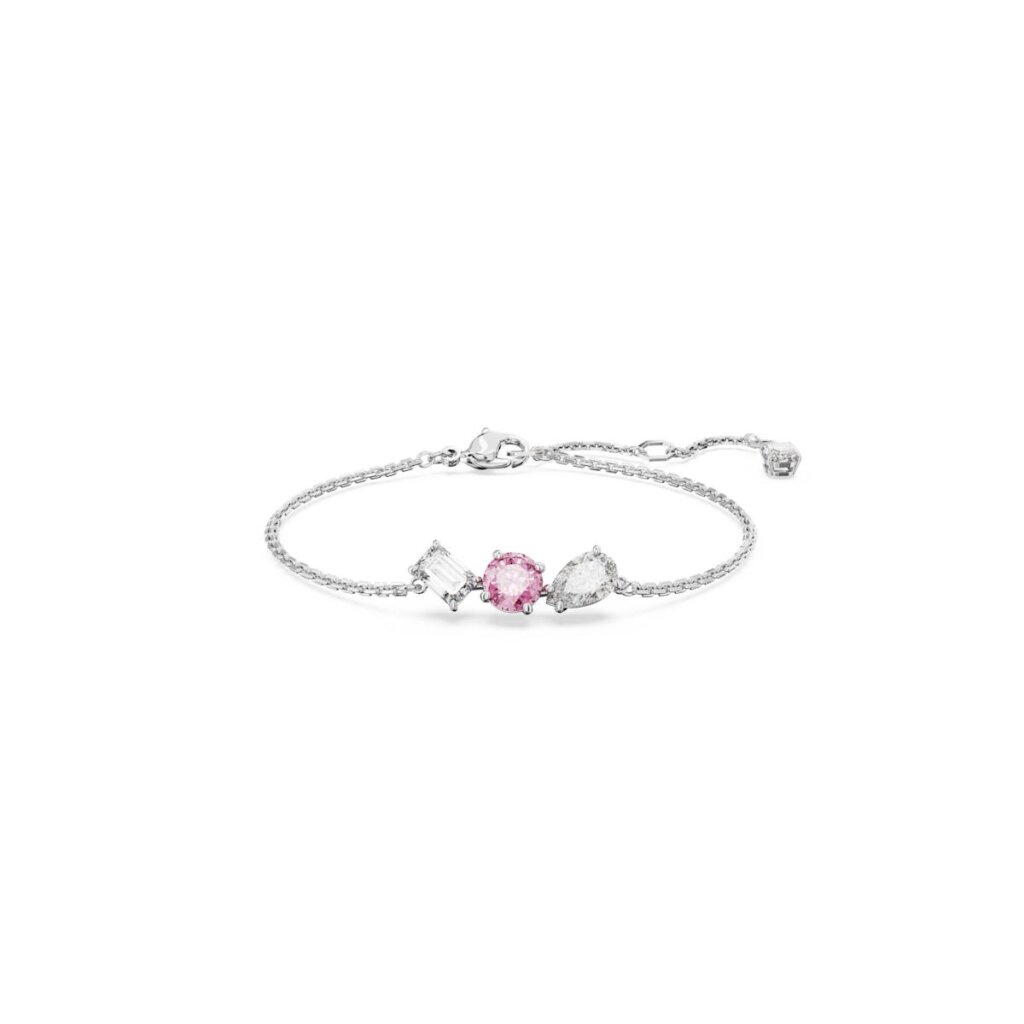 Accented with a vibrant flourish of color, this Mesmera bracelet is ready to impress. The rhodium plated design is worn on a delicate chain with a hanging elongation and features a trio of prong-set Swarovski Zirconia in varying shapes, including a central square stone in bright blue. A bold mix of cuts that would make a wondrous gift.