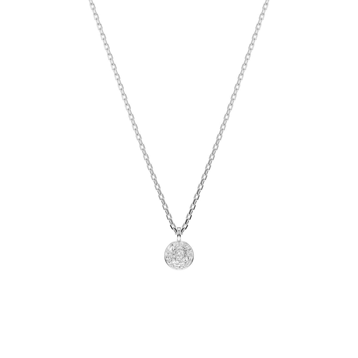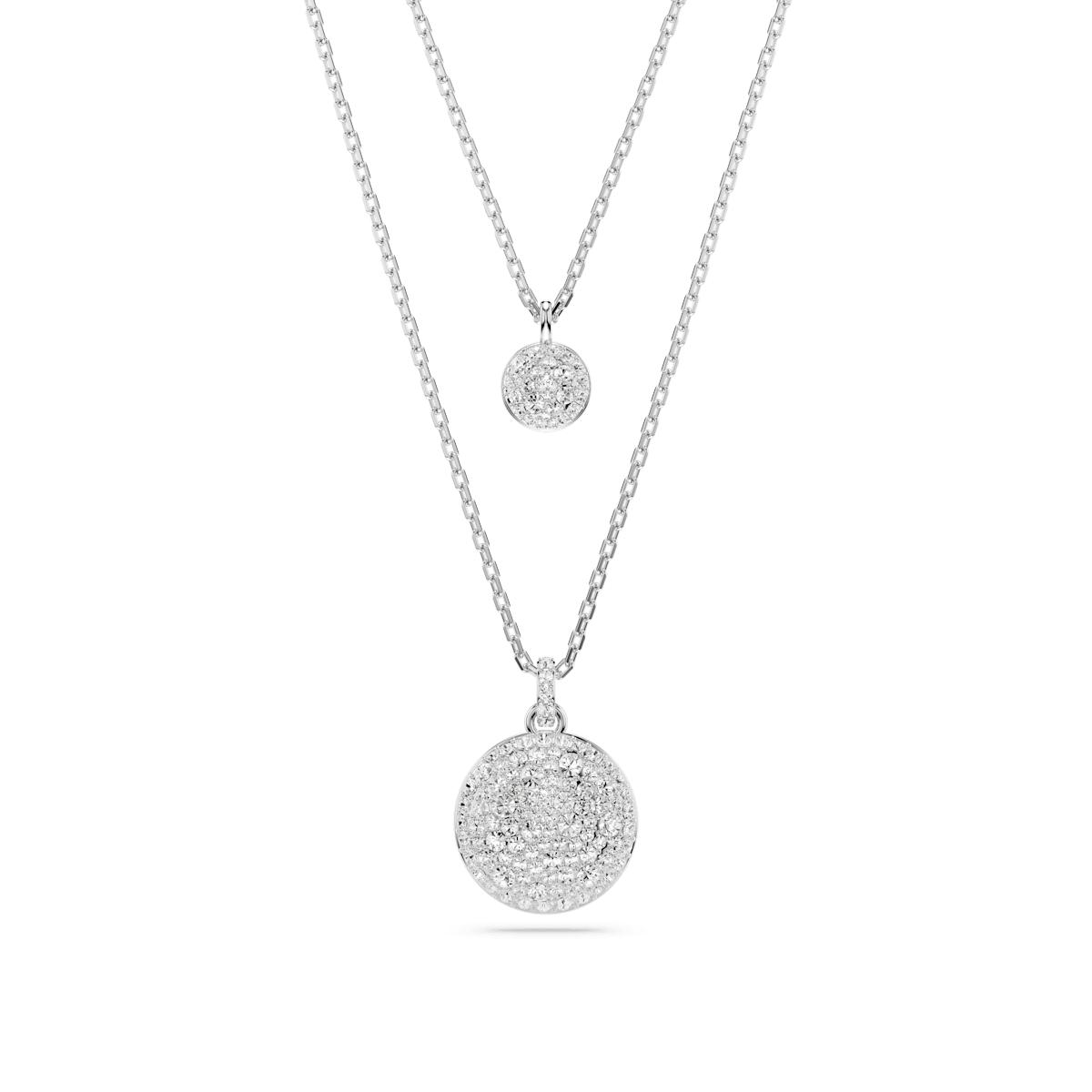 This shimmering layered pendant is the ideal way to fill your style with light. The rhodium-plated design features two chains, each with a domed meteor motif that is beautifully adorned with a snow pavé of clear round crystals in different sizes. For extra versatility, the pendant can be reversed, revealing a halo of crystals around the larger motif, and a single crystal at the center of the smaller motif. A wondrous gift for yourself or a loved one.