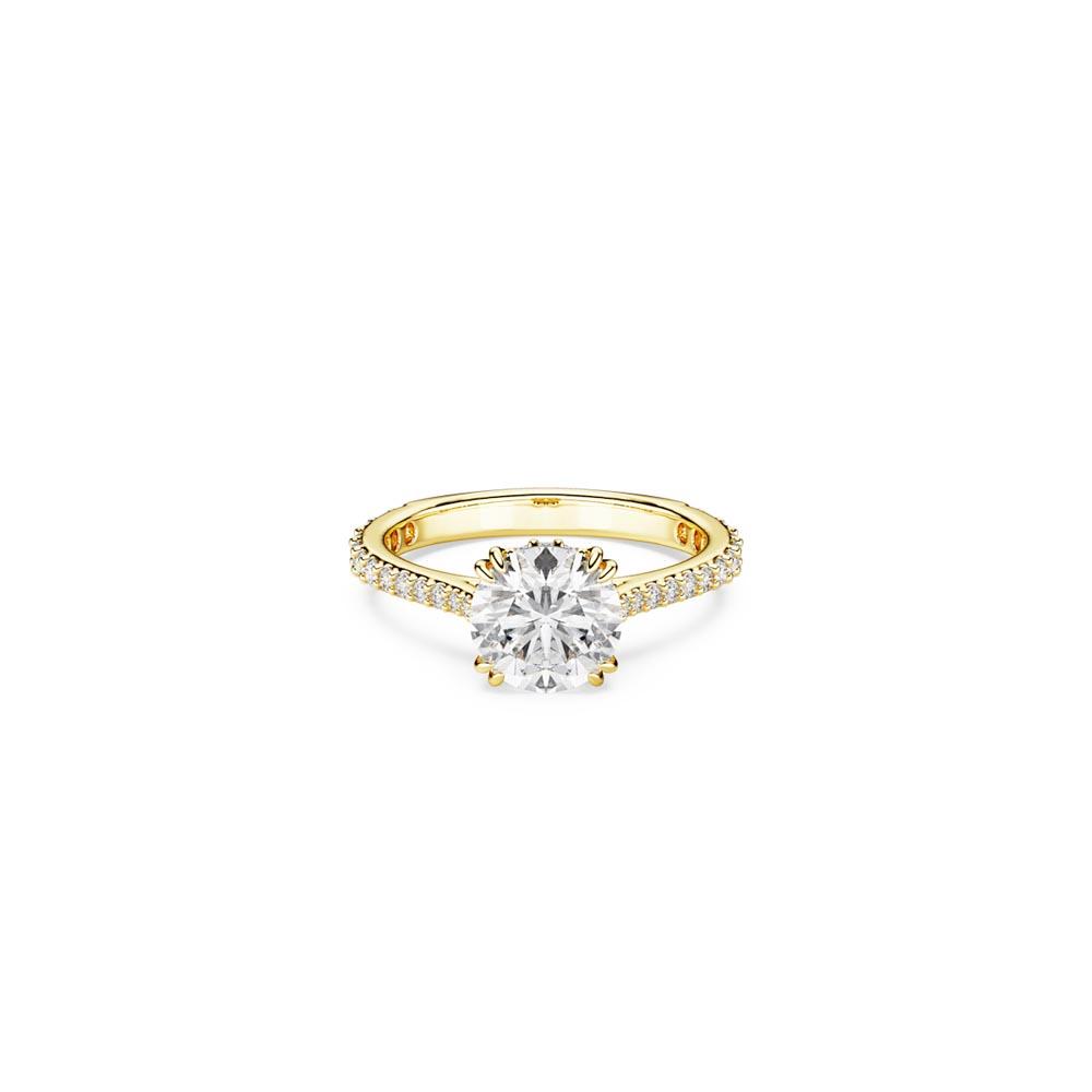 Proving there is power in simplicity, this striking cocktail ring is a wardrobe essential. Expertly crafted, the scene-stealing princess-cut center stone is enhanced with elegant pavé on the gallery and along the gold-tone plated band. Wear it solo and shine bright.