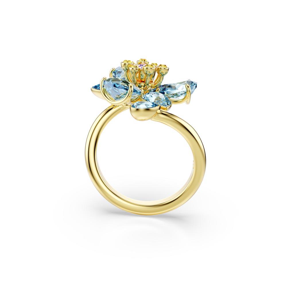 Take your nature-inspired style to the next level with this glittering motif ring. The gold-tone plated band spirals around the finger with a central flower crafted from blue and yellow crystals. The different shapes and shades ensure there is magic to be found in every detail. Combine this ring with a matching Idyllia pendant to achieve an all-over look of color and joy.