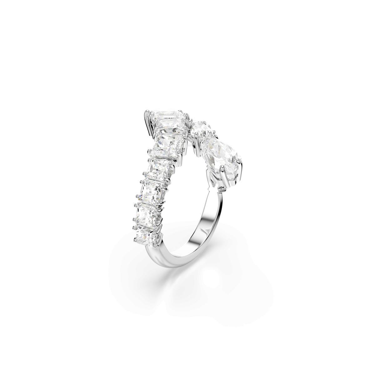 Sophistication shines brightly in this exquisite Matrix ring. The rhodium plated design is adorned with an array of clear Swarovski Zirconia in pear and square cuts, featuring a gradient of sizes for an unexpected silhouette. Wear it alongside a matching Matrix cuff and enhance your inner light.