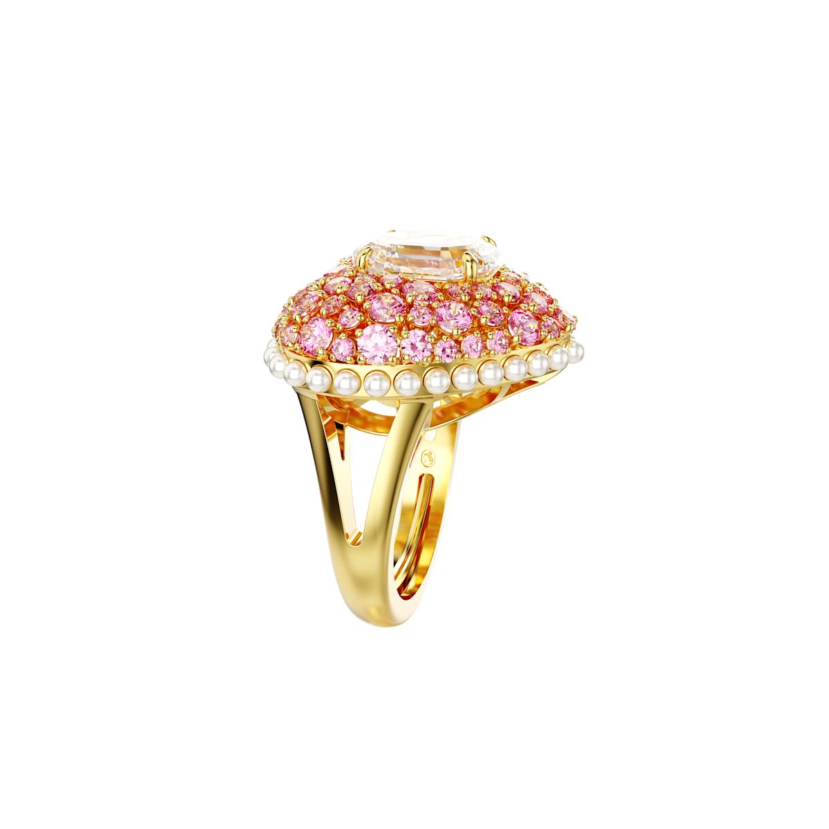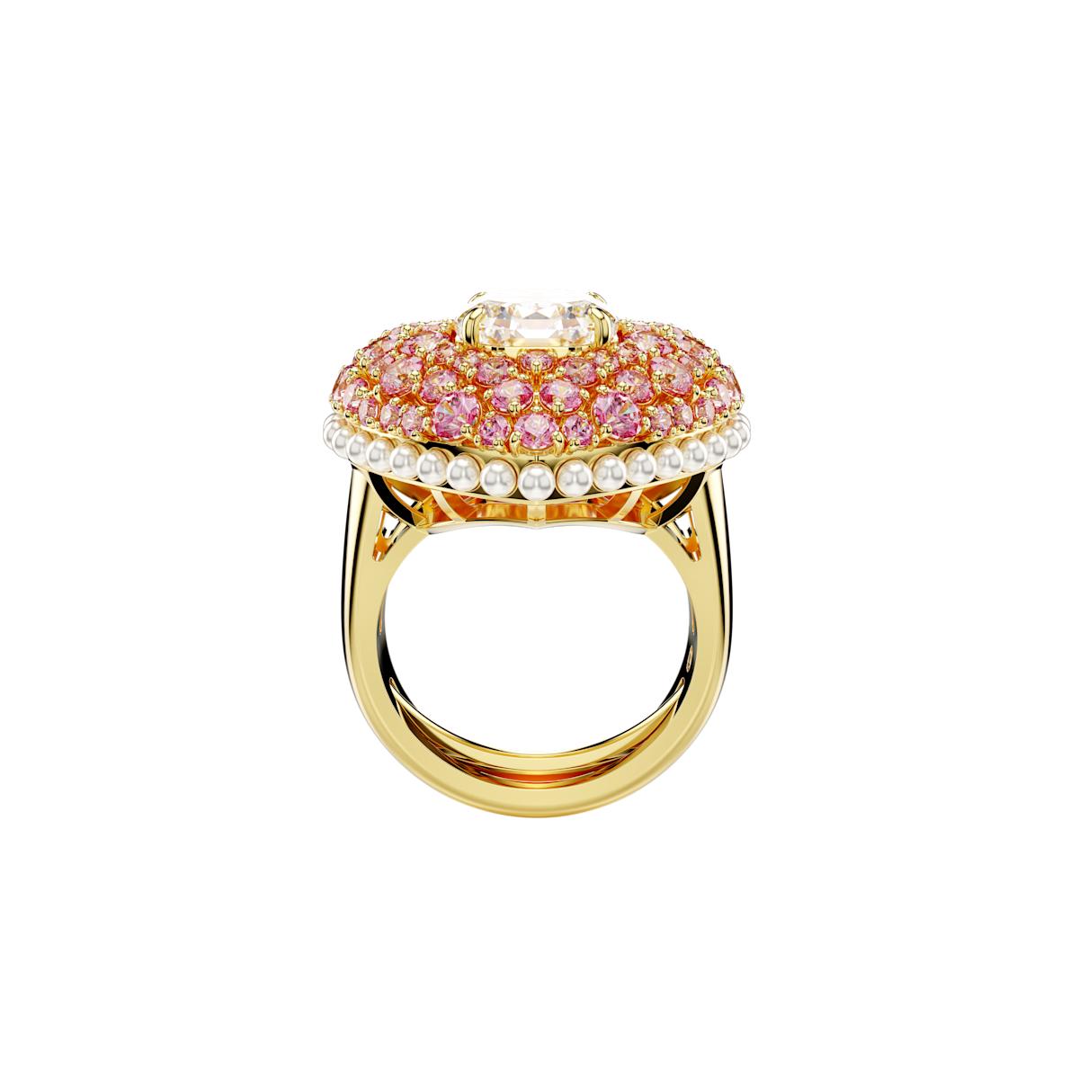 In this captivating heart-shaped ring, color and craftsmanship go hand in hand. The gold-tone plated jewelry is adorned with round pink Swarovski Zirconia, set in place using the dazzling chatonnage technique. At the center, an octagonal dancing stone catches the light from every angle, while the edges of the motif are embellished with an array of tiny Crystal Pearls. The perfect choice for an enchanting gift.