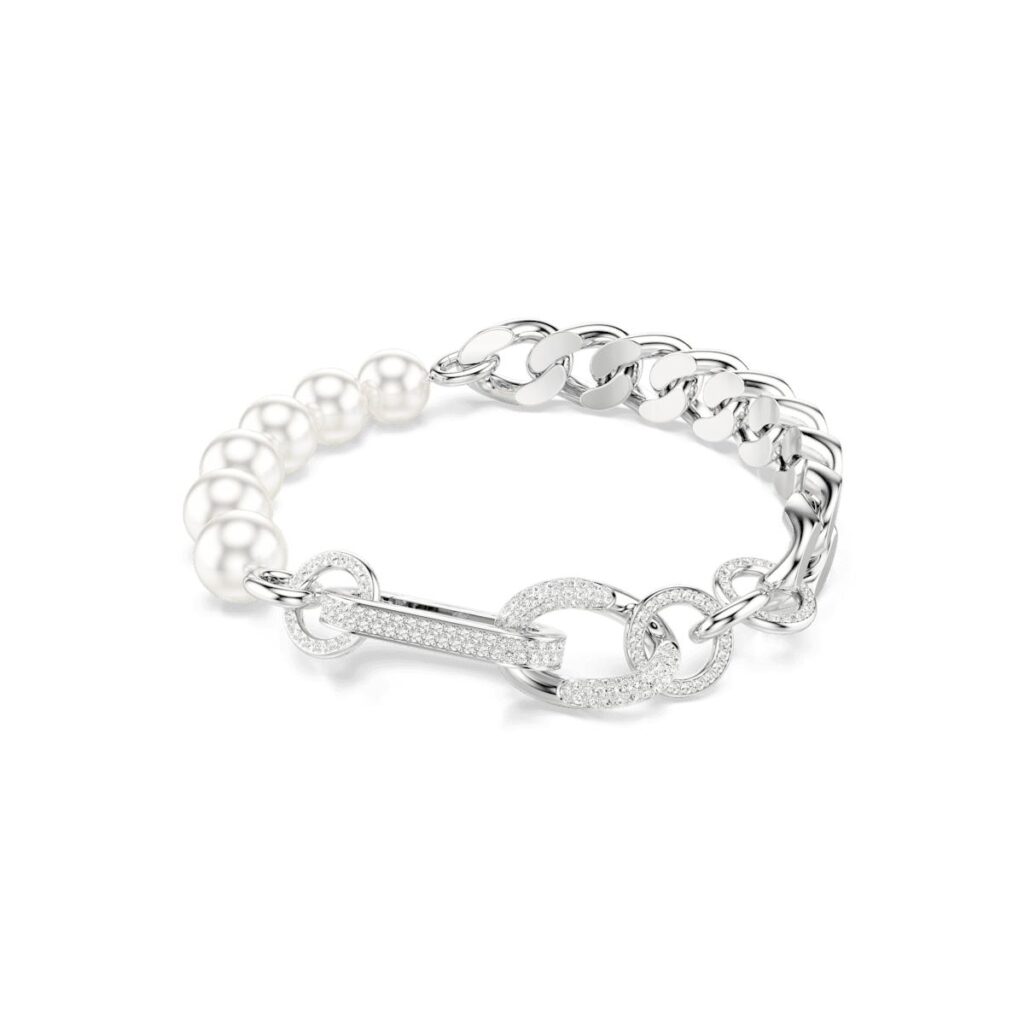 Ideal for self-expression, this stunning bracelet is split between a delicate chain and a strand of white Swarovski Crystal Pearls, with an elegant swan motif that hangs at the center. This iconic emblem showcases two intertwined swans, in rhodium and ruthenium plating, with an all-over decoration of black and white Swarovski Zirconia in round and marquise cuts. A beautiful starting point for your own personalized style.