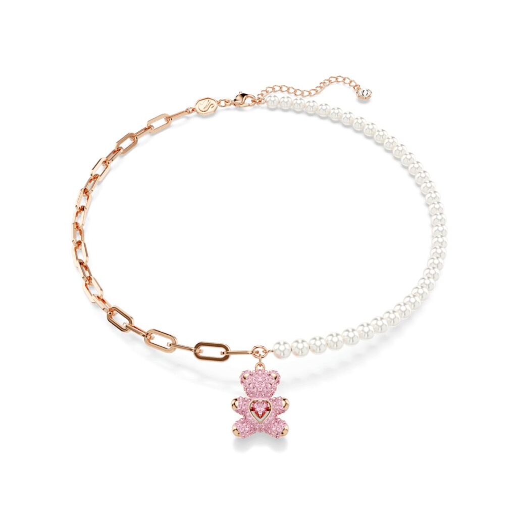This radiant teddy bear bracelet transforms a cuddly childhood favorite into a luxurious piece of modern style. The heart-warming teddy motif is embellished with pink crystals and worn on a bracelet of Swarovski Crystal Pearls and a rose gold-tone plated chain. Style yours with a matching necklace to complete the set.
