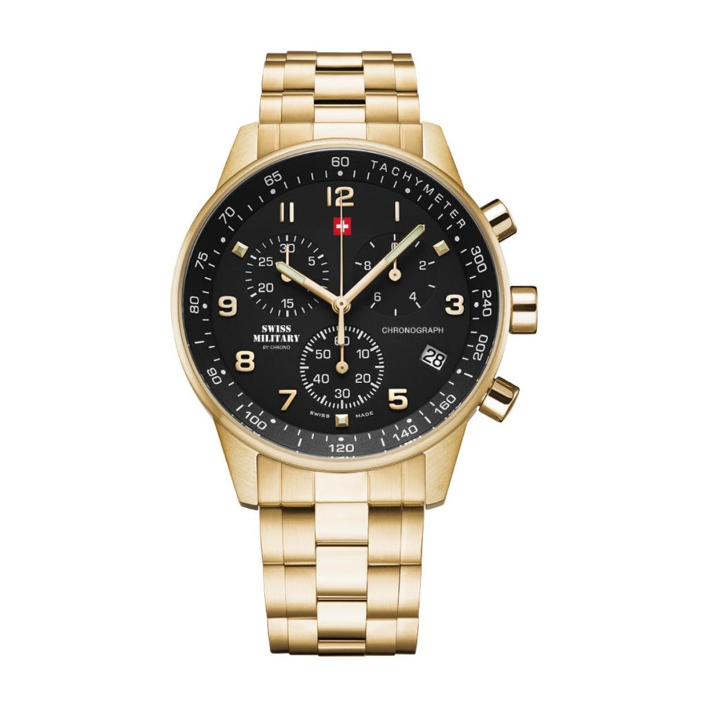 Klassisk dameklokke fra Swiss Military med svart skinnreim og urskive med gullfargede detaljer