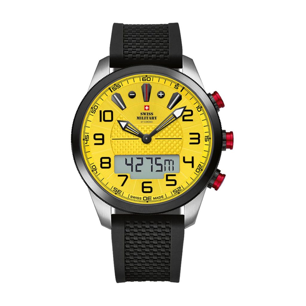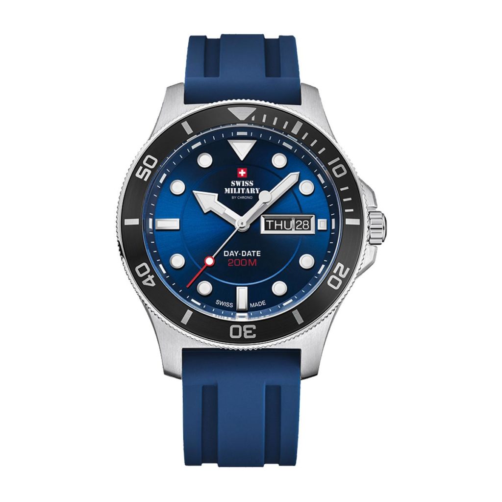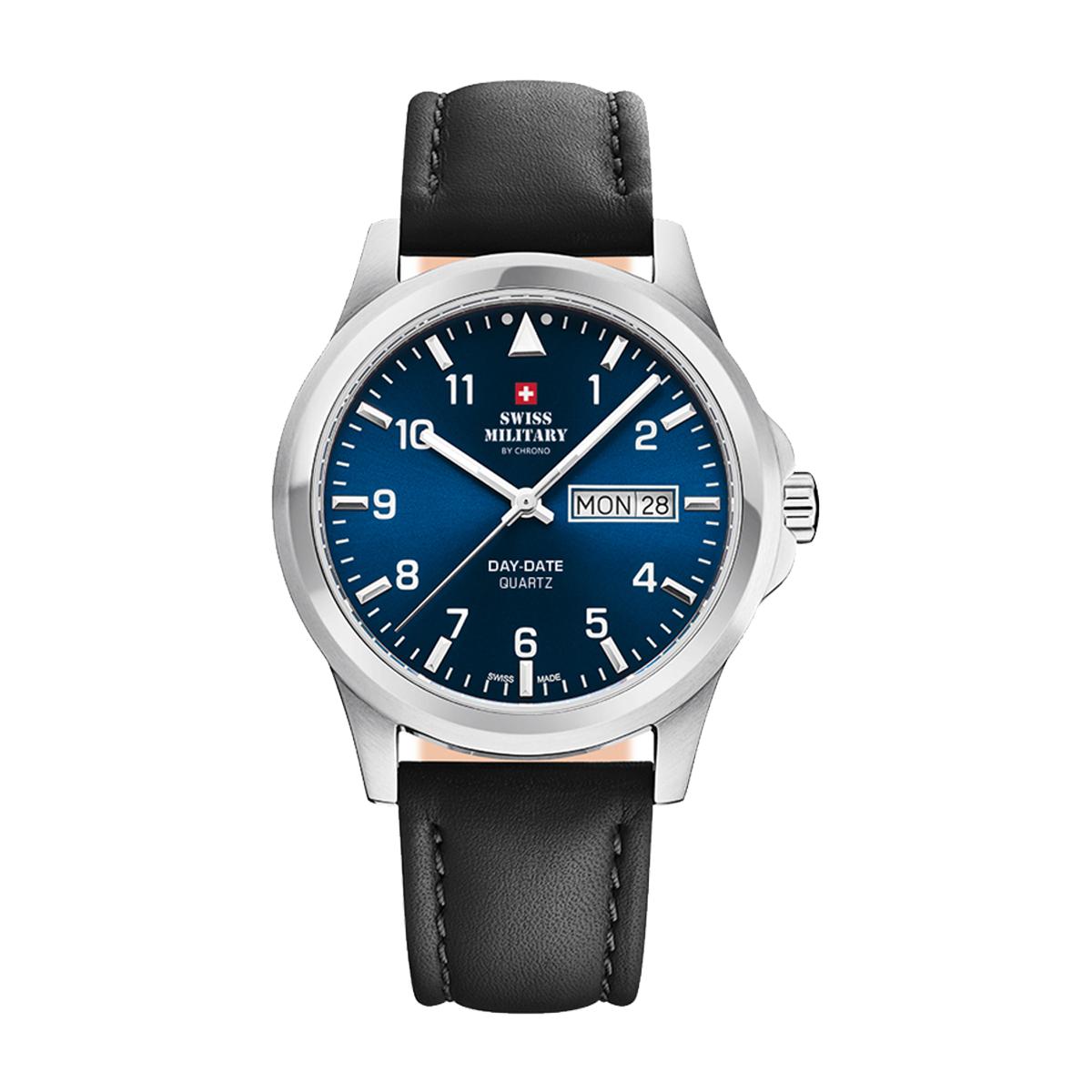 Klassisk stilren klokke i stål med svart skinnreim fra Swiss Military. Klokken er vanntett til 50M og har dag datovisning med mineralglass.