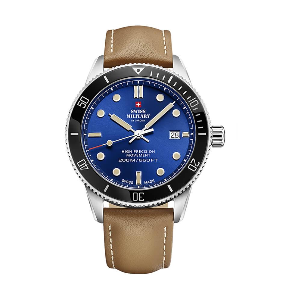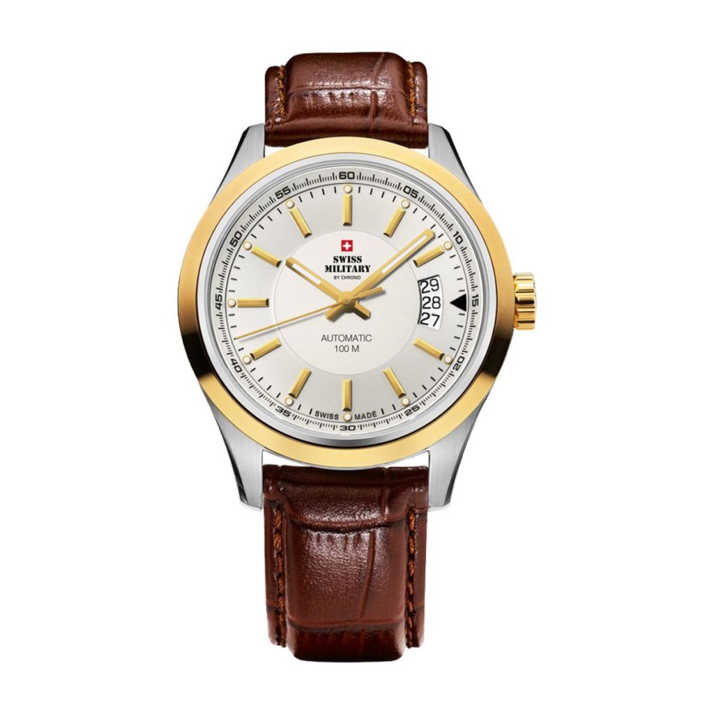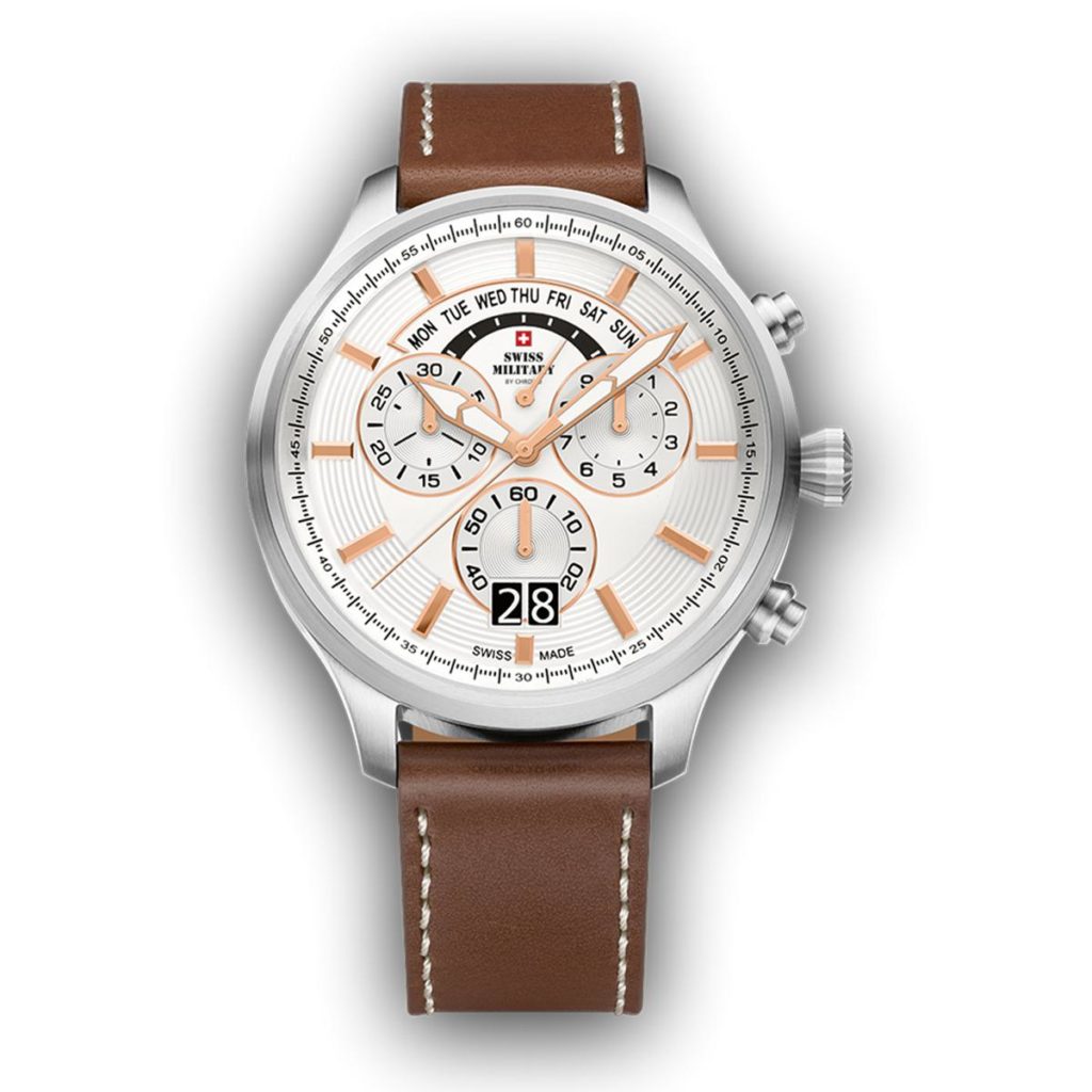 Klokkse fra Swiss Military med hvit urskive og brun skinnreim med kronograf.