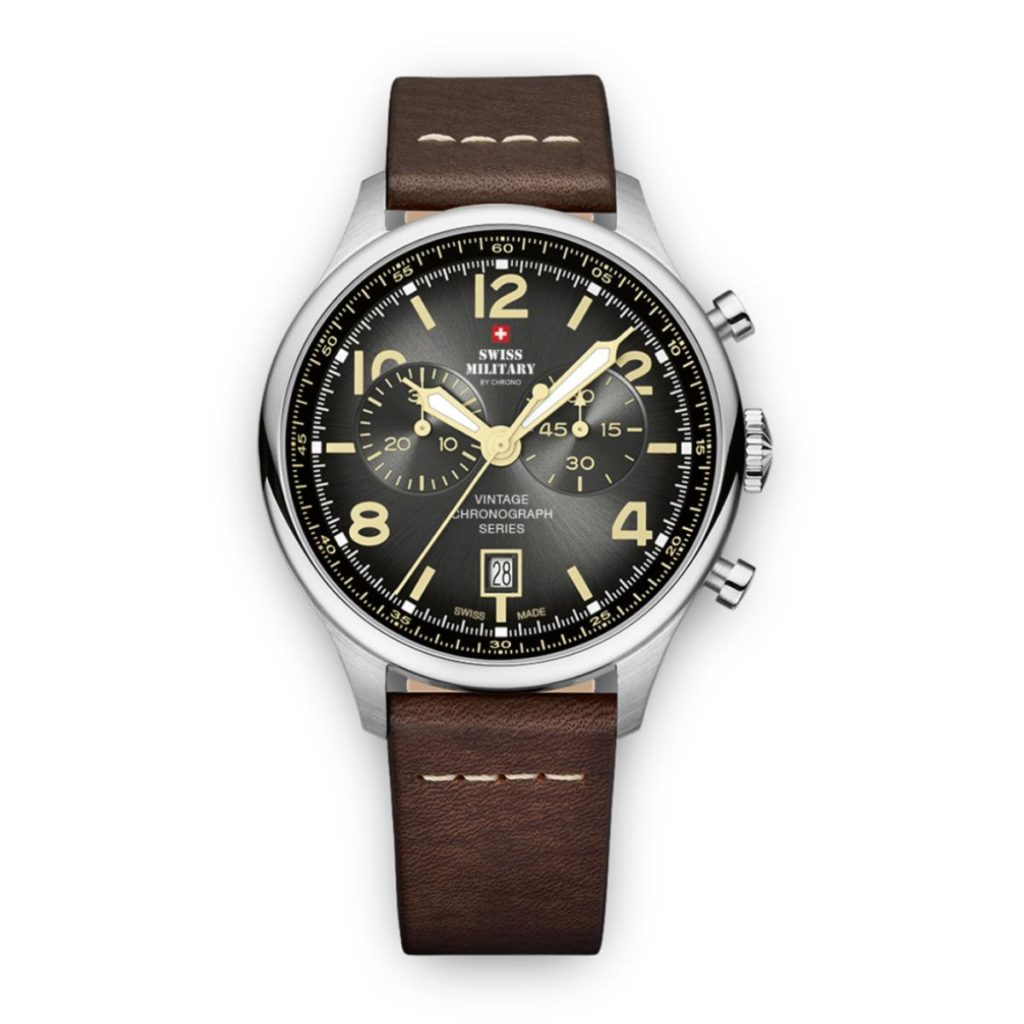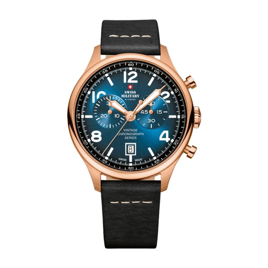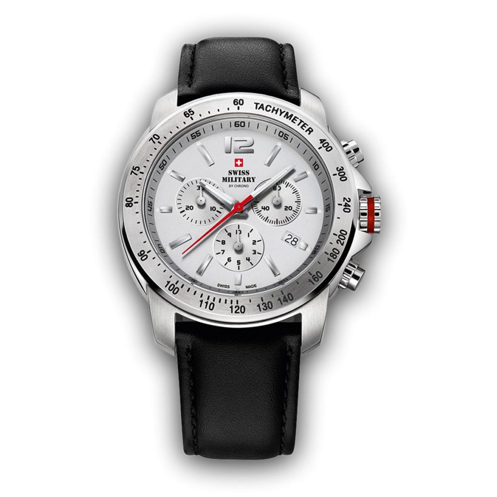 Stilig herreklokke fra Swiss Military med svart skinnreim og urskive.