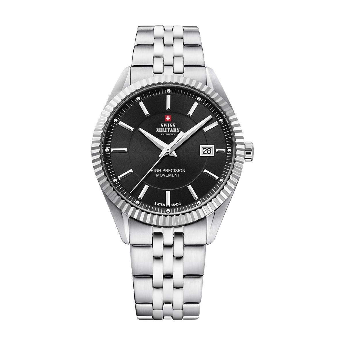 Klassisk klokke fra Swiss Military med stållenke. Klokken er vanntett til 50M og har datovisning med saffirbelagt mineralglass.