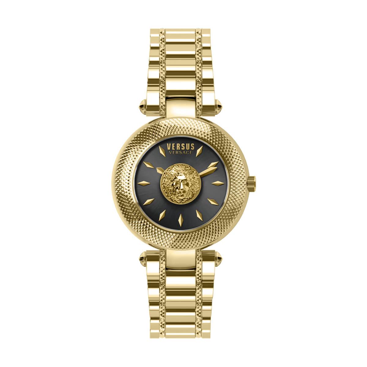 Dameklokke fra Versus Versace med gullfarget stållenke og svart urskive.